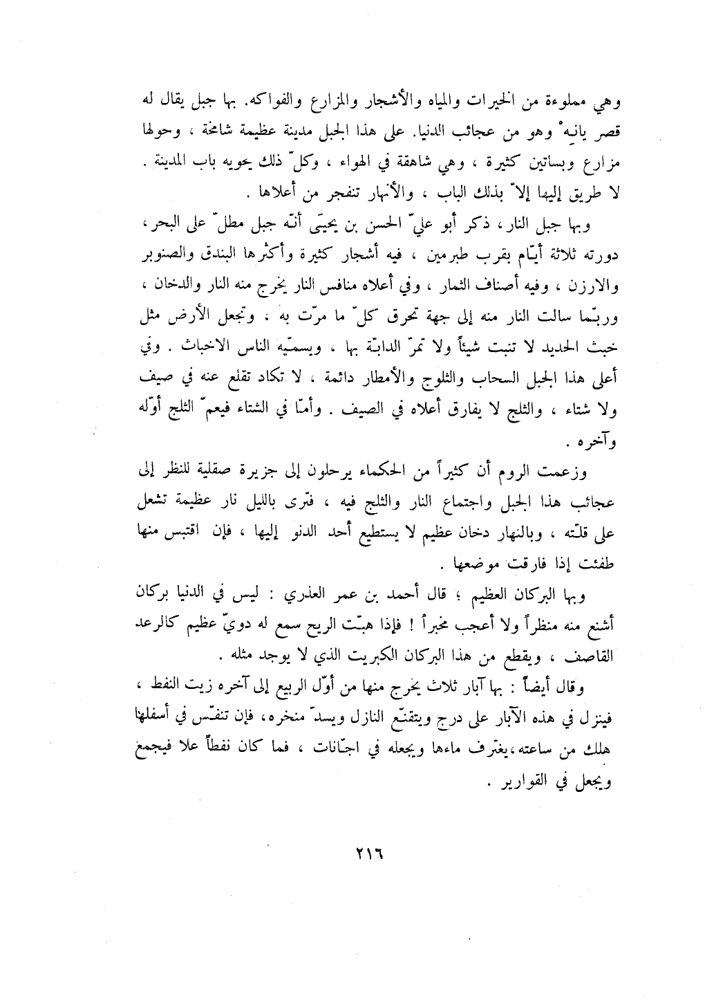 وقال أيضاً: بها آبار ثلاث يخرج منها من أول الربيع إلى آخره زيت النفط، فينزل في هذه الآبار على درج ويتقنع النازل ويسد منخره، فإن تنفس في أسفلها هلك من ساعته، يغترف ماءها ويجعله في اجانات، فما كان نفطاً علا فيجمع ويجعل في القوارير.