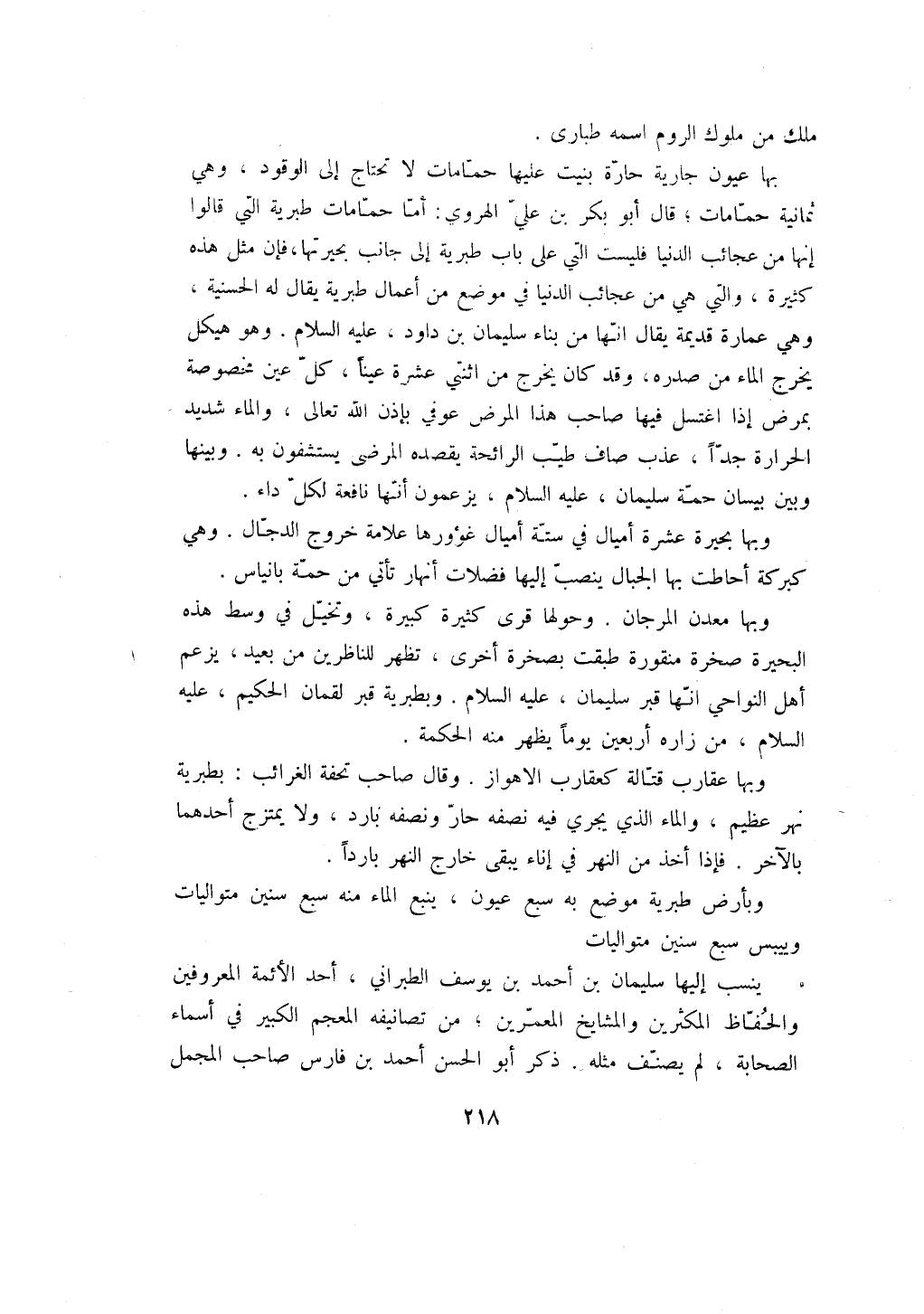وبأرض طبرية موضع به سبع عيون، ينبع الماء منه سبع سنين متواليات وييبس سبع سنين متواليات ينسب إليها سليمان بن أحمد بن يوسف الطبراني، أحد الأئمة المعروفين والحفاظ المكثرين والمشايخ المعمرين؛ من تصانيفه المعجم الكبير في أسماء الصحابة، لم ينصف مثله. ذكر أبو الحسن أحمد بن فارس صاحب المجمل