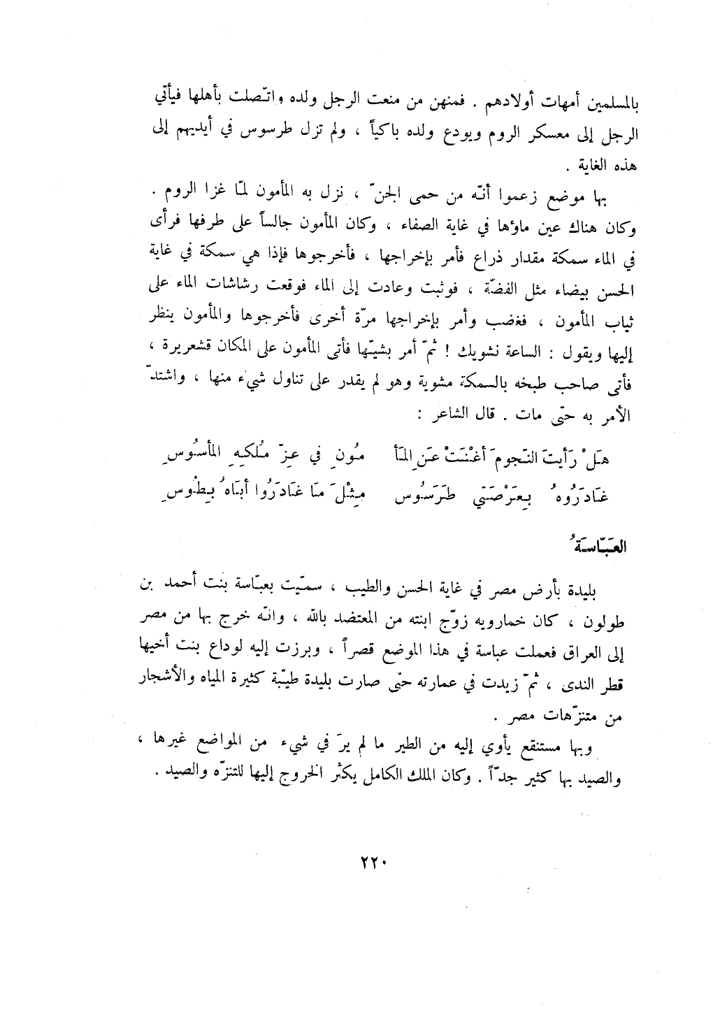 بالمسلمين أمهات أولادهم. فمنهن من منعت الرجل ولده واتصلت بأهلها فيأتي الرجل إلى معسكر الروم ويودع ولده باكياً، ولم تزل طرسوس في أيديهم إلى هذه الغاية.