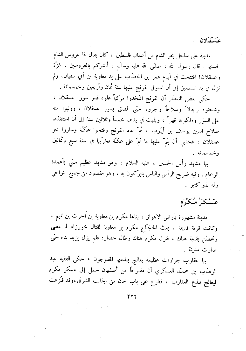 مدينة على ساحل بحر الشام من أعمال فلسطين، كان يقال لها عروس الشام لحسنها. قال رسول الله، صلى الله عليه وسلم: أبشركم بالعروسين، غزة وعسقلان! افتتحت في أيام عمر بن الخطاب على يد معاوية بن أبي سفيان، ولم تزل في يد المسلمين إلى أن استولى الفرنج عليها سنة ثمان وأربعين وخمسمائة.