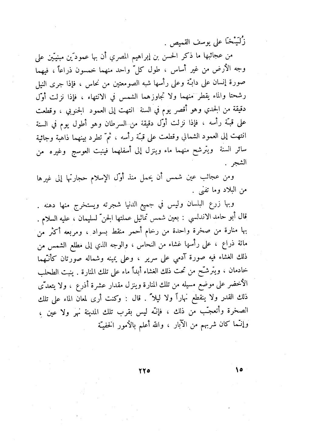 وبها زرع البلسان وليس في جميع الدنيا شجرته ويستخرجه منها دهنه. قال أبو حامد الاندلسي: بعين شمس تماثيل عملتها الجن لسليمان، عليه السلام. بها منارة من صخرة واحدة من رخام أحمر منقط بسواد، ومربعه أكثر من مائة ذراع، على رأسها غشاء من النحاس، والوجه الذي إلى مطلع الشمس من ذلك الغشاء فيه صورة آدمي على سرير، وعلى يمينه وشماله صورتان كأنهما خادمان، ويترشح من تحت ذلك الغشاء أبداً ماء على تلك المنارة. ينبت الطحلب الأخضر على موضع مسيله من تلك المنارة وينزل مقدار عشرة أذرع، ولا يتعدى ذلك القدر ولا ينقطع نهاراً ولا ليلاً. قال: وكنت أرى لمعان الماء على تلك الصخرة وأتعجب من ذلك، فإنه ليس بقرب تلك المدينة نهر ولا عين، وإنما كان شربهم من الآبار، والله أعلم بالأمور الخفية