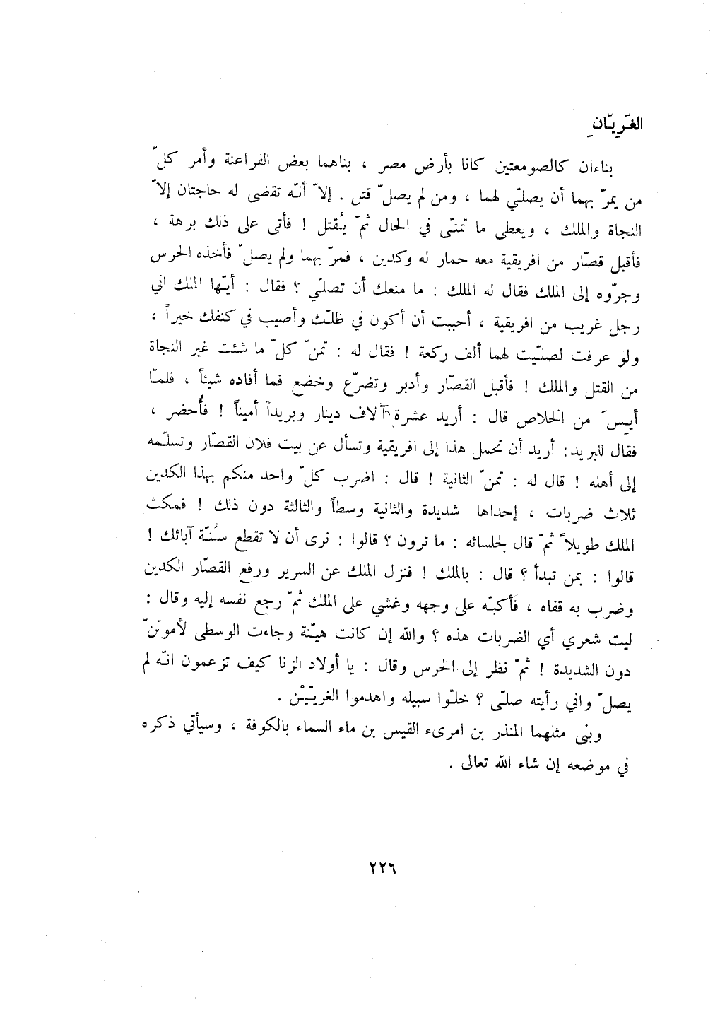 بناءان كالصومعتين كانا بأرض مصر، بناهما بعض الفراعنة وأمر كل من يمر بهما أن يصلي لهما، ومن لم يصل قتل. إلا أنه تقضى له حاجتان إلا النجاة والملك، ويعطى ما تمنى في الحال ثم يقتل! فأتى على ذلك برهة، فأقبل قصار من افريقية معه حمار له وكدين، فمر بهما ولم يصل فأخذه الحرس وجروه إلى الملك فقال له الملك: ما منعك أن تصلي؟ فقال: أيها الملك اني رجل غريب من افريقية، أحببت أن أكون في ظلك وأصيب في كنفك خيراً، ولو عرفت لصليت لهما ألف ركعة! فقال له: تمن كل ما شئت غير النجاة من القتل والملك! فأقبل القصار وأدبر وتضرع وخضع فما أفاده شيئاً، فلما أيس من الخلاص قال: أريد عشرة آلاف دينار وبريداً أميناً! فأحضر، فقال للبريد: أريد أن تحمل هذا إلى افريقية وتسأل عن بيت فلان القصار وتسلمه إلى أهله! قال له: تمن الثانية! قال: اضرب كل واحد منكم بهذا الكدين ثلاث ضربات، إحداها شديدة والثانية وسطاً والثالثة دون ذلك! فمكث الملك طويلاً ثم قال لجلسائه: ما ترون؟ قالوا: نرى أن لا تقطع سنة آبائك! قالوا: بمن تبدأ؟ قال: بالملك! فنزل الملك عن السرير ورفع القصار الكدين وضرب به قفاه، فأكبه على وجهه وغشي على الملك ثم رجع نفسه إليه وقال: ليت شعري أي الضربات هذه؟ والله إن كانت هينة وجاءت الوسطى لأموتن دون الشديدة! ثم نظر إلى الحرس وقال: يا أولاد الزنا كيف تزعمون انه لم يصل واني رأيته صلى؟ خلوا سبيله واهدموا الغريين.
