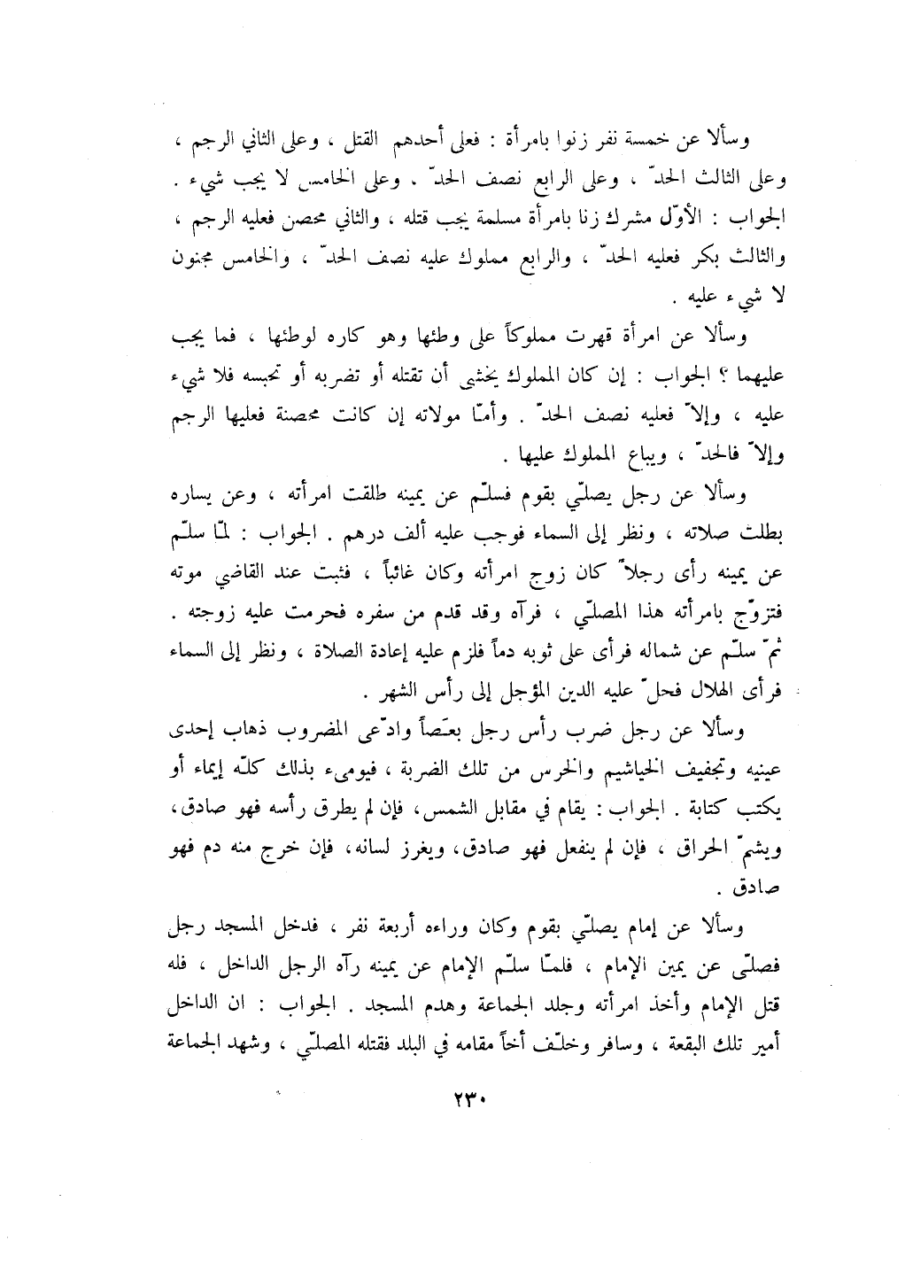 وسألا عن إمام يصلي بقوم وكان وراءه أربعة نفر، فدخل المسجد رجل فصلى عن يمين الإمام، فلما سلم الإمام عن يمينه رآه الرجل الداخل، فله قتل الإمام وأخذ امرأته وجلد الجماعة وهدم المسجد. الجواب: ان الداخل أمير تلك البقعة، وسافر وخلف أخاً مقامه في البلد فقتله المصلي، وشهد الجماعة