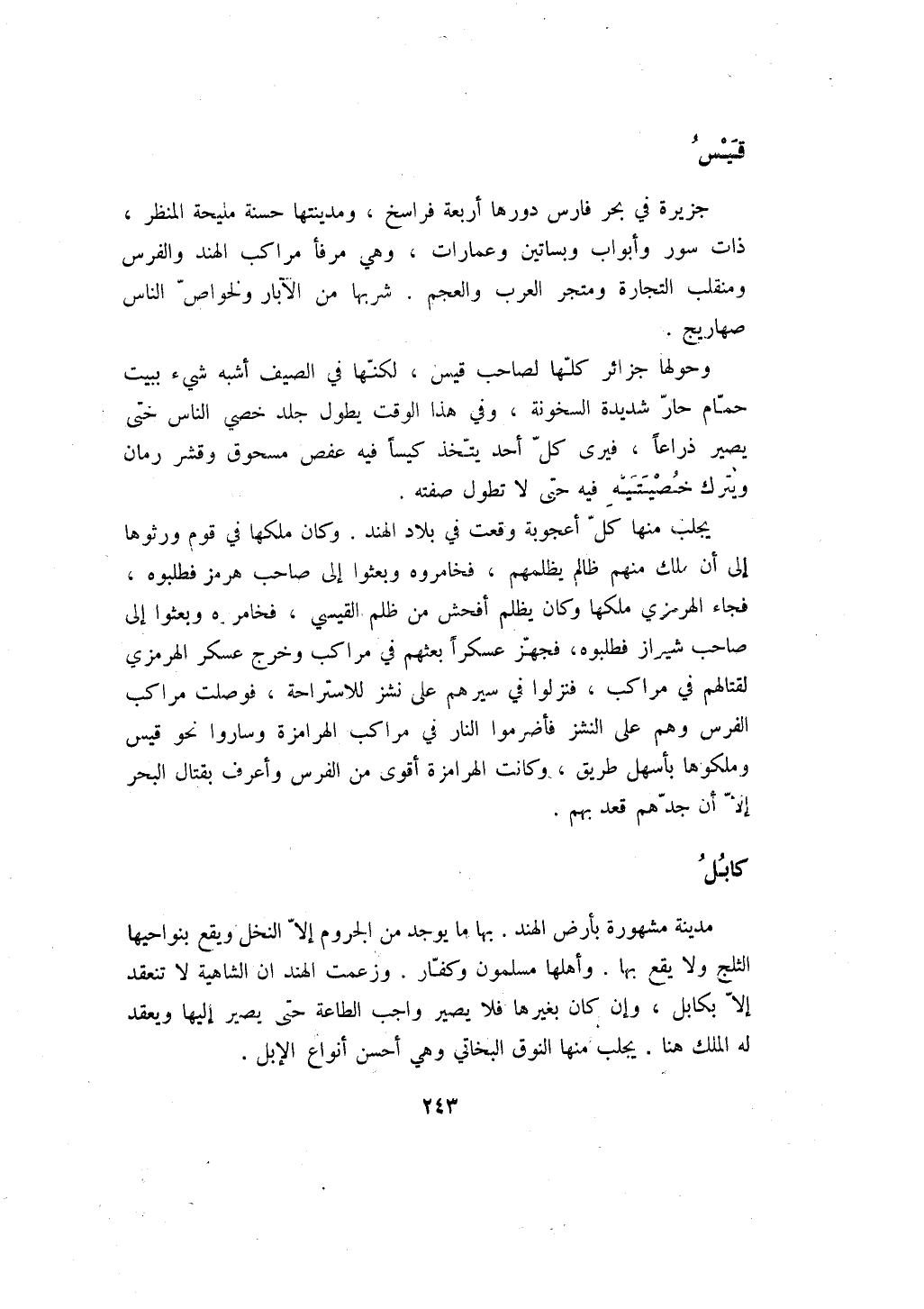يجلب منها كل أعجوبة وقعت في بلاد الهند. وكان ملكها في قوم ورثوها إلى أن ملك منهم ظالم يظلمهم، فخامروه وبعثوا إلى صاحب هرمز فطلبوه، فجاء الهرمزي ملكها وكان يظلم أفحش من ظلم القيسي، فخامروه وبعثوا إلى صاحب شيراز فطلبوه، فجهز عسكراً بعثهم في مراكب وخرج عسكر الهرمزي لقتالهم في مراكب، فنزلوا في سيرهم على نشز للاستراحة، فوصلت مراكب الفرس وهم على النشز فاضرموا النار في مراكب الهرامزة وساروا نحو قيس وملكوها بأسهل طريق، وكانت الهرامزة أقوى من الفرس وأعرف بقتال البحر إلا أن جدهم قعد بهم.
