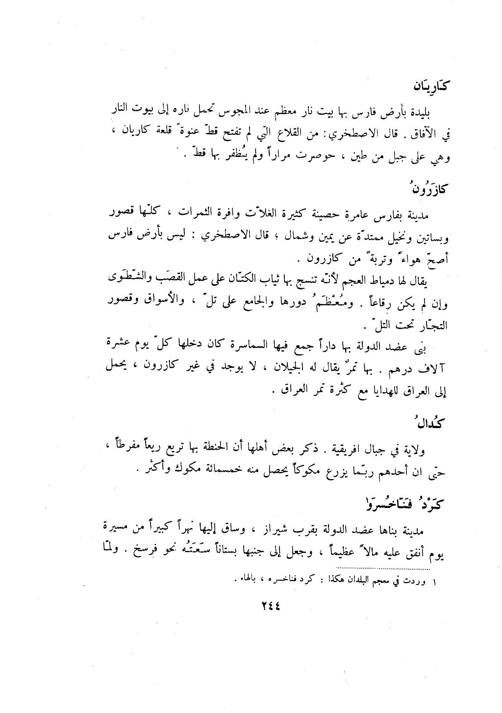 مدينة بفارس عامرة حصينة كثيرة الغلات وافرة الثمرات، كلها قصور وبساتين ونخيل ممتدة عن يمين وشمال؛ قال الاصطخري: ليس بأرض فارس أصح هواءً وتربةً من كازرون.