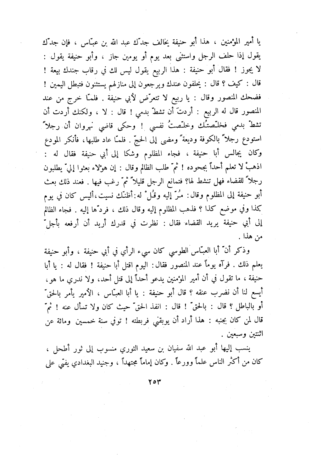 وذكر أن أبا العباس الطوسي كان سيء الرأي في أبي حنيفة، وأبو حنيفة يعلم ذلك. فرآه يوماً عند المنصور فقال: اليوم اقتل أبا حنيفة! فقال له: يا أبا حنيفة، ما تقول في أن أمير المؤمنين يدعو أحداً إلى قتل أحد، ولا ندري ما هو، أيسع لنا أن نضرب عنقه؟ قال أبو حنيفة: يا أبا العباس، الأمير يأمر بالحق أو بالباطل؟ قال: بالحق! قال: انفذ الحق حيث كان ولا تسأل عنه! ثم قال لمن كان بجنبه: هذا أراد أن يوبقني فربطته! توفي سنة خمسين ومائة عن اثنتين وسبعين.