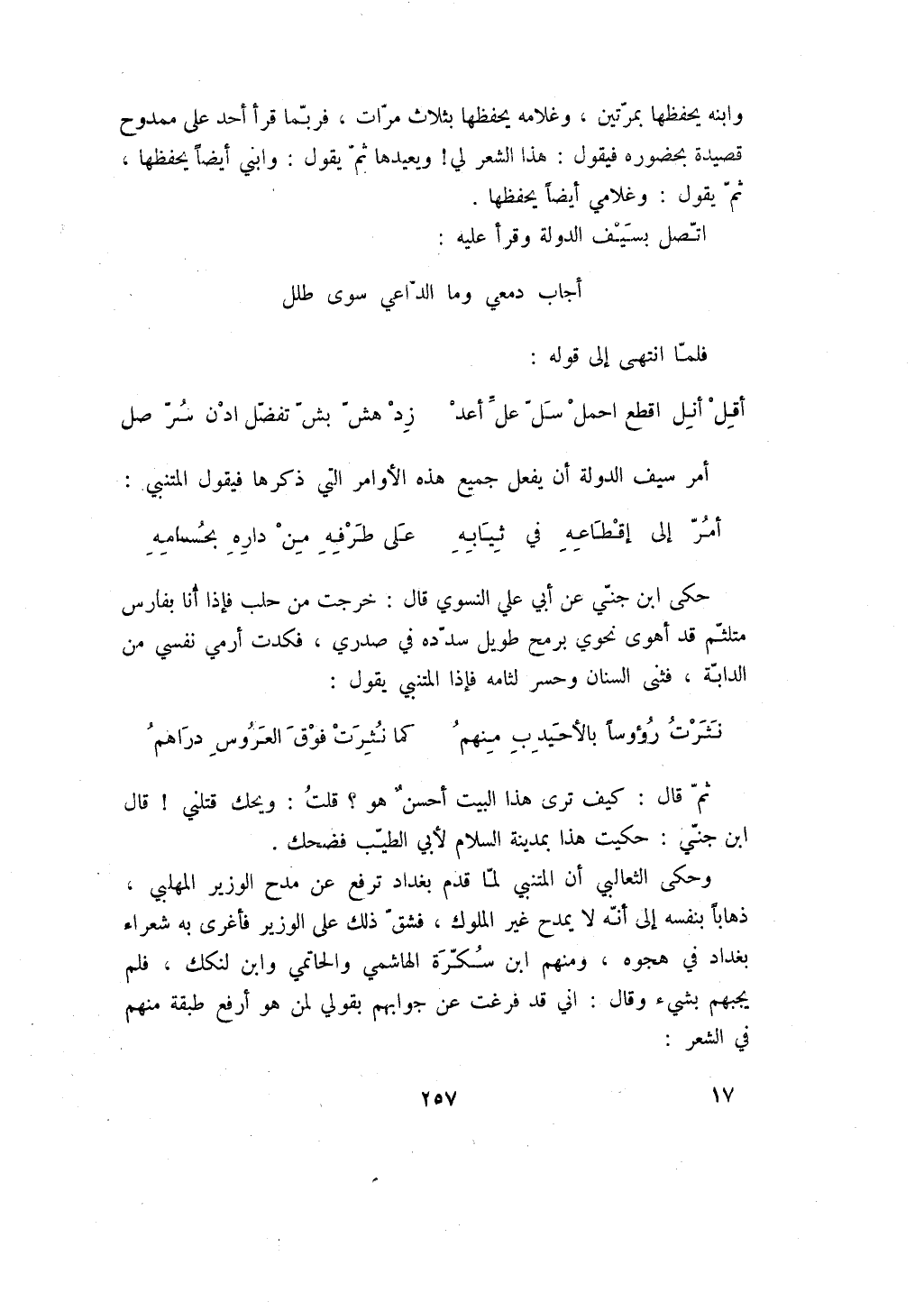 ثم قال: كيف ترى هذا البيت أحسن هو؟ قلت: ويحك قتلني! قال ابن جني: حكيت هذا بمدينة السلام لأبي الطيب فضحك.