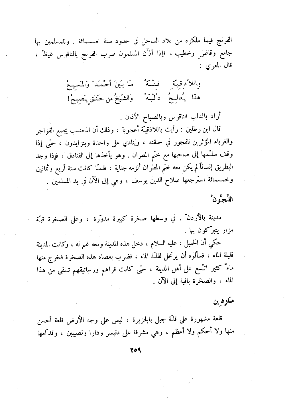 الفرنج فيما ملكوه من بلاد الساحل في حدود سنة خمسمائة. وللمسلمين بها جامع وقاض وخطيب، فإذا أذن المسلمون ضرب الفرنج بالناقوس غيظاً، قال المعري: