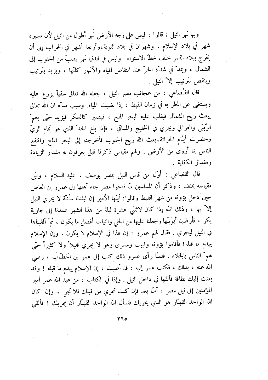 قال القضاعي: من عجائب مصر النيل، جعله الله تعالى سقياً يزرع عليه ويستغنى عن المطر به في زمان القيظ، إذا نضبت المياه. وسبب مده ان الله تعالى يبعث ريح الشمال فيقلب عليه البحر الملح، فيصير كالسكر فيزيد حتى يعم الربى والعوالي ويجري في الخليج والمساقي، فإذا بلغ الحد الذي هو تمام الري وحضرت أيام الحراثة، بعث الله ريح الجنوب فأخرجته إلى البحر الملح وانتفع الناس بما أروى من الأرض. ولهم مقياس ذكرنا قبل يعرفون به مقدار الزيادة ومقدار الكفاية.