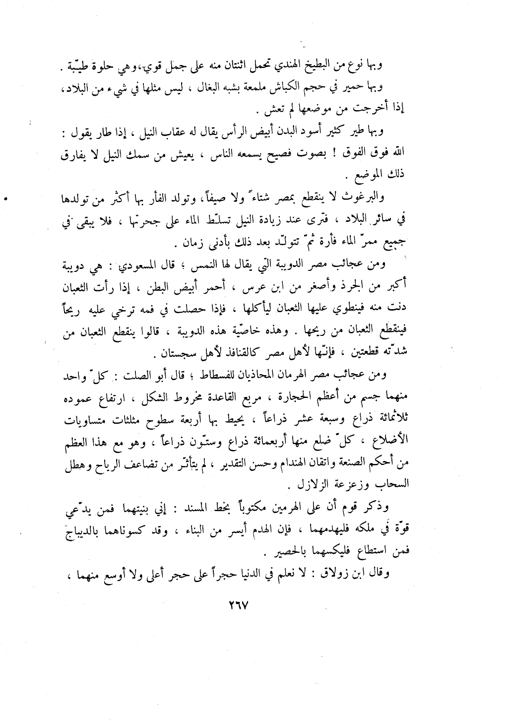 والبرغوث لا ينقطع بمصر شتاءً ولا صيفاً، وتولد الفأر بها أكثر من تولدها في سائر البلاد، فترى عند زيادة النيل تسلط الماء على جحرتها، فلا يبقى في جميع ممر الماء فأرة ثم تتولد بعد ذلك بأدنى زمان.