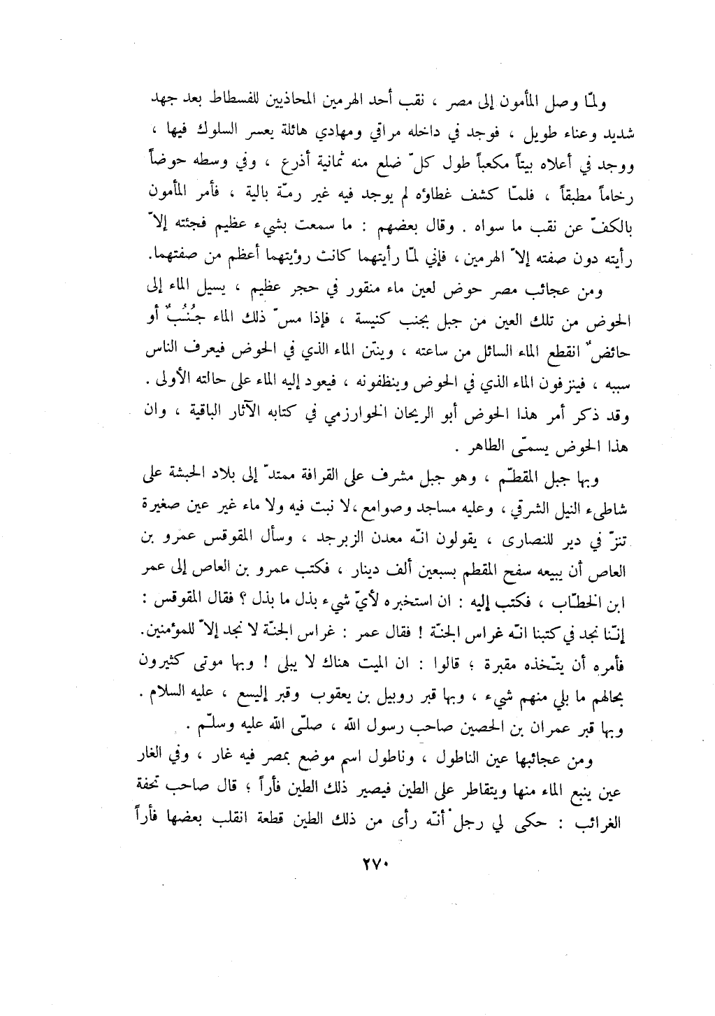 ومن عجائب مصر حوض لعين ماء منقور في حجر عظيم، يسيل الماء إلى الحوض من تلك العين من جبل بجنب كنيسة، فإذا مس ذلك الماء جنب أو حائض انقطع الماء السائل من ساعته، وينتن الماء الذي في الحوض فيعرف الناس سببه، فينزفون الماء الذي في الحوض وينظفونه، فيعود إليه الماء على حالته الأولى. وقد ذكر أمر هذا الحوض أبو الريحان الخوارزمي في كتابه الآثار الباقية، وان هذا الحوض يسمى الطاهر.