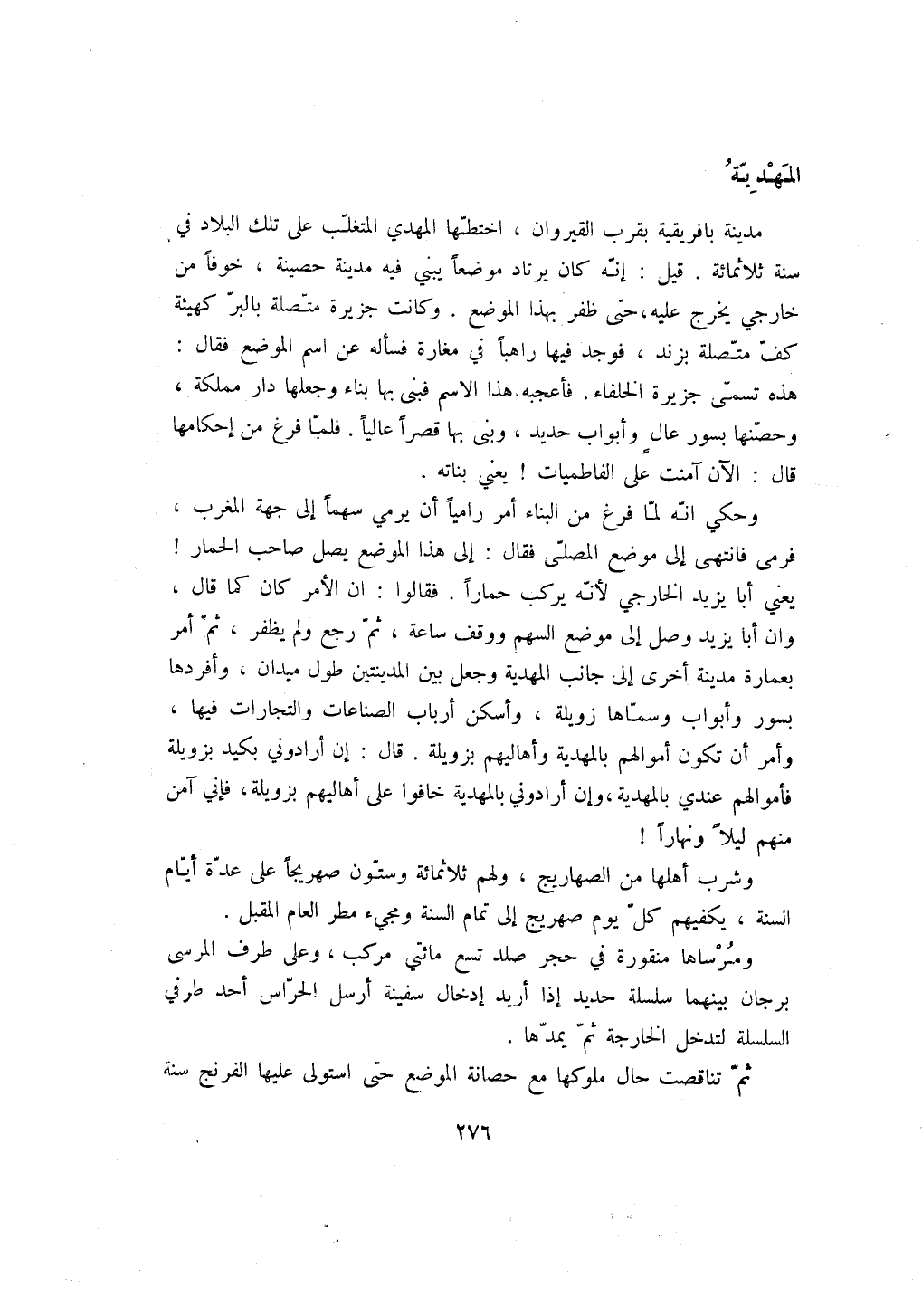 وحكي انه لما فرغ من البناء أمر رامياً أن يرمي سهماً إلى جهة المغرب، فرمى فانتهى إلى موضع المصلى فقال: إلى هذا الموضع يصل صاحب الحمار! يعني أبا يزيد الخارجي لأنه يركب حماراً. فقالوا: ان الأمر كان كما قال، وان أبا يزيد وصل إلى موضع السهم ووقف ساعة، ثم رجع ولم يظفر، ثم أمر بعمارة مدينة أخرى إلى جانب المهدية وجعل بين المدينتين طول ميدان، وأفردها بسور وأبواب وسماها زويلة، وأسكن أرباب الصناعات والتجارات فيها، وأمر أن تكون أموالهم بالمهدية وأهاليهم بزويلة. قال: إن أرادوني بكيد بزويلة فأموالهم عندي بالمهدية، وإن أرادوني بالمهدية خافوا على أهاليهم بزويلة، فإني آمن منهم ليلاً ونهاراً! وشرب أهلها من الصهاريج، ولهم ثلاثمائة وستون صهريجاً على عدة أيام السنة، يكفيهم كل يوم صهريج إلى تمام السنة ومجيء مطر العام المقبل.