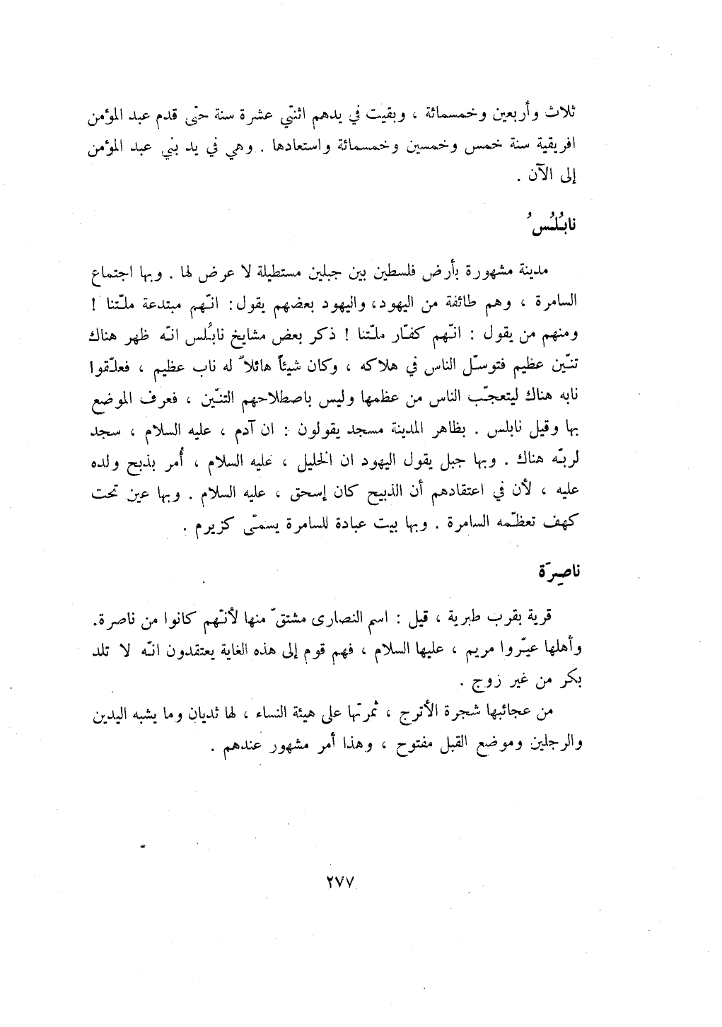 مدينة مشهورة بأرض فلسطين بين جبلين مستطيلة لا عرض لها، وبها اجتماع السامرة، وهم طائفة من اليهود، واليهود بعضهم يقول: انهم مبتدعة ملتنا! ومنهم من يقول: انهم كفار ملتنا! ذكر بعض مشايخ نابلس انه ظهر هناك تنين عظيم فتوسل الناس في هلاكه، وكان شيئاً هلائلاً له ناب عظيم، فعلقوا نابه هناك ليتعجب الناس من عظمها وليس باصطلاحهم التنين، فعرف الموضع بها وقيل نابلس. بظاهر المدينة مسجد يقولون: ان آدم، عليه السلام، سجد لربه هناك. وبها جبل يقول اليهود ان الخليل، عليه السلام، أمر بذبح ولده عليه، لأن في اعتقادهم أن الذبيح كان إسحق، عليه السلام. وبها عين تحت كهف تعظمه السامرة. وبها بيت عبادة للسامرة يسمى كزيرم.