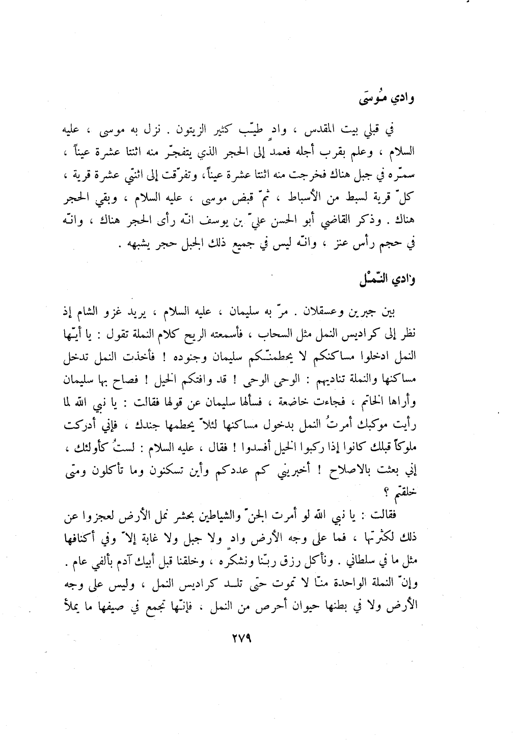 بين جبرين وعسقلان. مر به سليمان، عليه السلام، يريد غزو الشام إذ نظر إلى كراديس النمل مثل السحاب، فأسمعته الريح كلام النملة تقول: يا أيها النمل ادخلوا مساكنكم لا يحطمنكم سليمان وجنوده! فأخذت النمل تدخل مساكنها والنملة تناديهم: الوحى الوحى! قد وافتكم الخيل! فصاح بها سليمان وأراها الخاتم، فجاءت خاضعة، فسألها سليمان عن قولها فقالت: يا نبي الله لما رأيت موكبك أمرت النمل بدخول مساكنها لئلا يحطمها جندك، فإني أدركت ملوكاً قبلك كانوا إذا ركبوا الخيل أفسدوا! فقال، عليه السلام: لست كأولئك، إني بعثت بالاصلاح! أخبريني كم عددكم وأين تسكنون وما تأكلون ومتى خلقتم؟ فقالت: يا نبي الله لو أمرت الجن والشياطين بحشر نمل الأرض لعجزوا عن ذلك لكثرتها، فما على وجه الأرض واد ولا جبل ولا غاية إلا وفي أكنافها مثل ما في سلطاني. ونأكل رزق ربنا ونشكره، وخلقنا قبل أبيك آدم بألفي عام. وإن النملة الواحدة منا لا تموت حتى تلد كراديس النمل، وليس على وجه الأرض ولا في بطنها حيوان أحرص من النمل، فإنها تجمع في صيفها ما يملأ