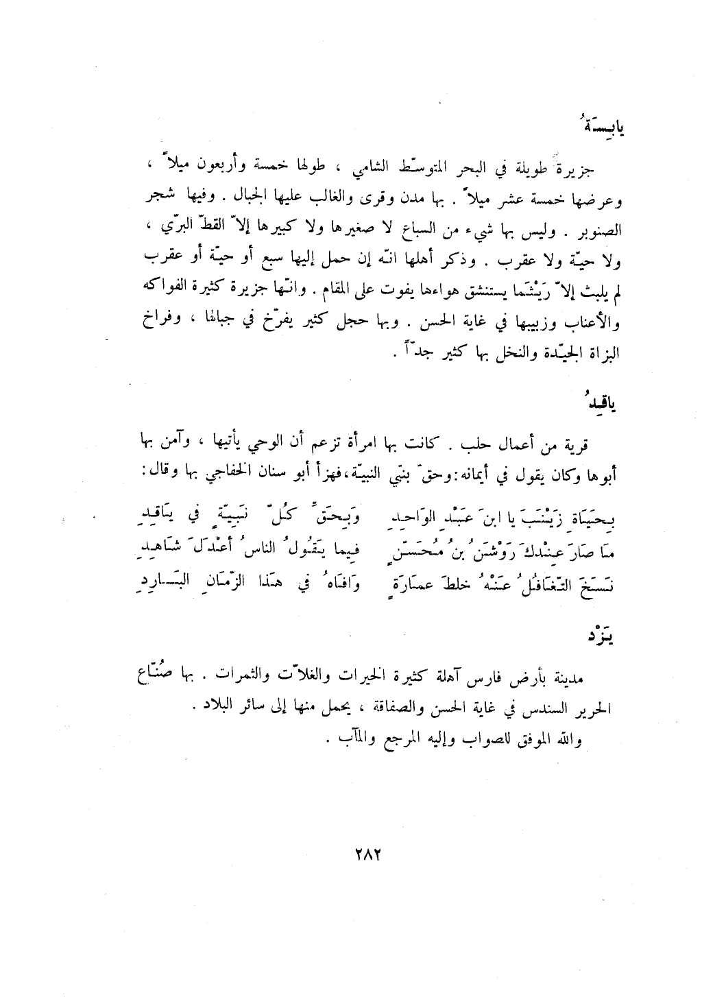 جزيرة طويلة في البحر المتوسط الشامي، طولها خمسة وأربعون ميلاً، وعرضها خمسة عشر ميلاً. بها مدن وقرى والغالب عليها الجبال. وفيها شجر الصنوبر. وليس بها شيء من السباع لا صغيرها ولا كبيرها إلا القط البري، ولا حية ولا عقرب. وذكر أهلها انه إن حمل إليها سبع أو حية أو عقرب لم يلبث إلا ريثما يستنشق هواءها يفوت على المقام. وانها جزيرة كثيرة الفواكه والأعناب وزبيبها في غاية الحسن. وبها حجل كثير يفرخ في جبالها، وفراخ البزاة الجيدة والنخل بها كثير جداً.