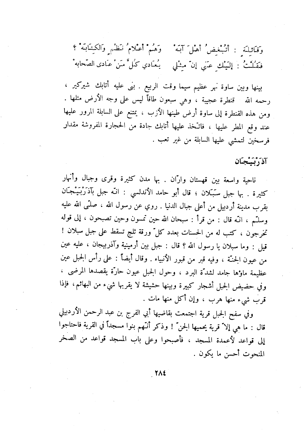 وفي سفح الجبل قرية اجتمعت بقاضيها أبي الفرج بن عبد الرحمن الأردبيلي قال: ما هي إلا قرية يحميها الجن! وذكر أنهم بنوا مسجداً في القرية فاحتاجوا إلى قواعد لأعمدة المسجد، فأصبحوا وعلى باب المسجد قواعد من الصخر المنحوت أحسن ما يكون.