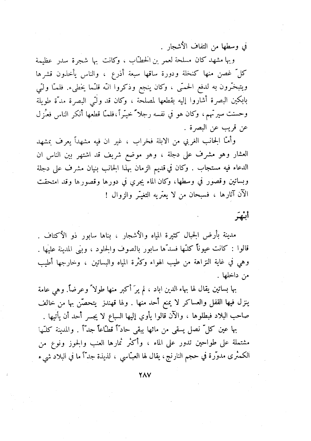وبها مشهد كان مسلحة لعمر بن الخطاب، وكانت بها شجرة سدر عظيمة كل غصن منها كنخلة ودورة ساقها سبعة أذرع، والناس يأخذون قشرها ويتبخرون به لدفع الحمى، وكان ينجع وذكروا انه قلما يخطيء. فلما ولي بابكين البصرة أشاروا إليه بقطعها لمصلحة، وكان قد ولي البصرة مدة طويلة وحسنت سيرتهم، وكان هو في نفسه رجلاً خيراً، فلما قطعها أنكر الناس فعزل عن قريب عن البصرة.