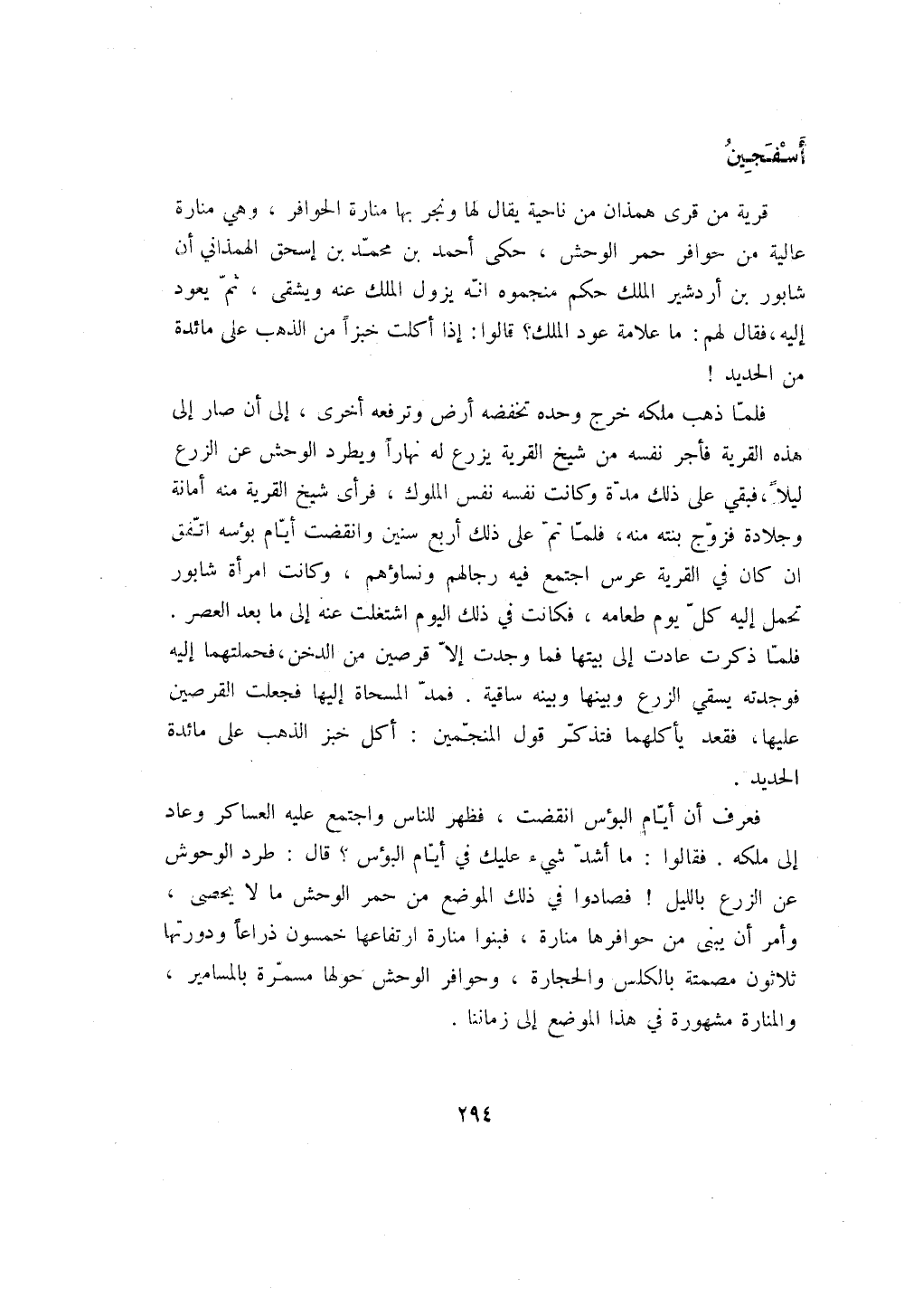 فعرف أن أيام البؤس انقضت، فظهر للناس واجتمع عليه العساكر وعاد إلى ملكه. فقالوا: ما أشد شيء عليك في أيام البؤس؟ قال: طرد الوحوش عن الزرع بالليل! فصادوا في ذلك الموضع من حمر الوحش ما لا يحصى، وأمر أن يبنى من حوافرها منارة، فبنوا منارة ارتفاعها خمسون ذراعاً ودورتها ثلاثون مصمتة بالكلس والحجارة، وحوافر الوحش حولها مسمرة بالمسامير، والمنارة مشهورة في هذا الموضع إلى زماننا.