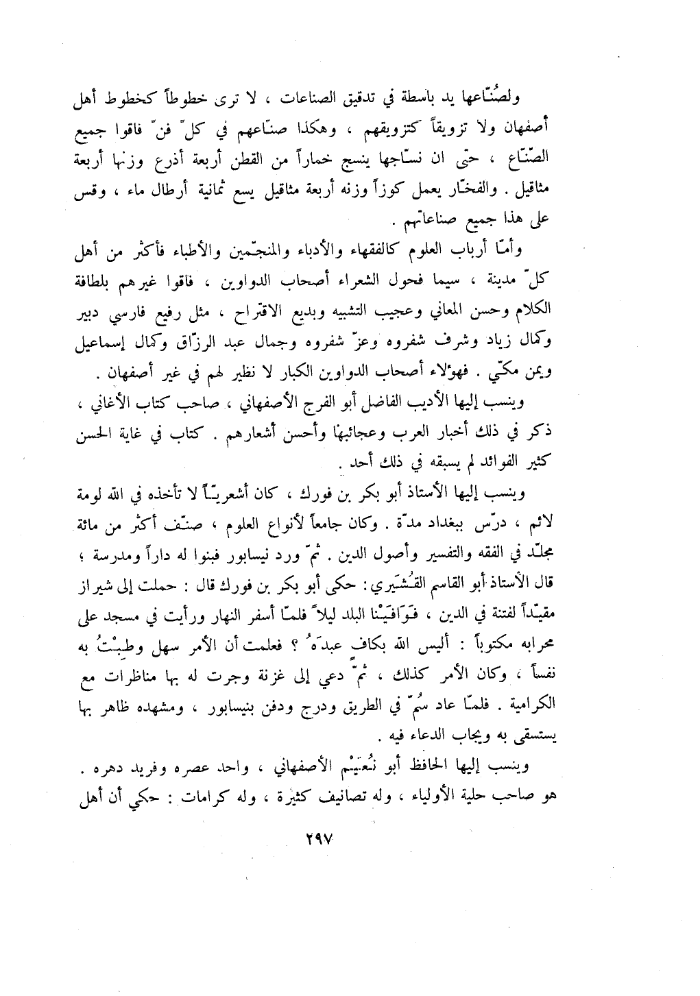 وأما أرباب العلوم كالفقهاء والأدباء والمنجمين والأطباء فأكثر من أهل كل مدينة، سيما فحول الشعراء أصحاب الدواوين، فاقوا غيرهم بلطافة الكلام وحسن المعاني وعجيب التشبيه وبديع الاقتراح، مثل رفيع فارسي دبير وكمال زياد وشرف شفروه وعز شفروه وجمال عبد الرزاق وكمال إسماعيل ويمن مكي. فهؤلاء أصحاب الدواوين الكبار لا نظير لهم في غير أصفهان.
