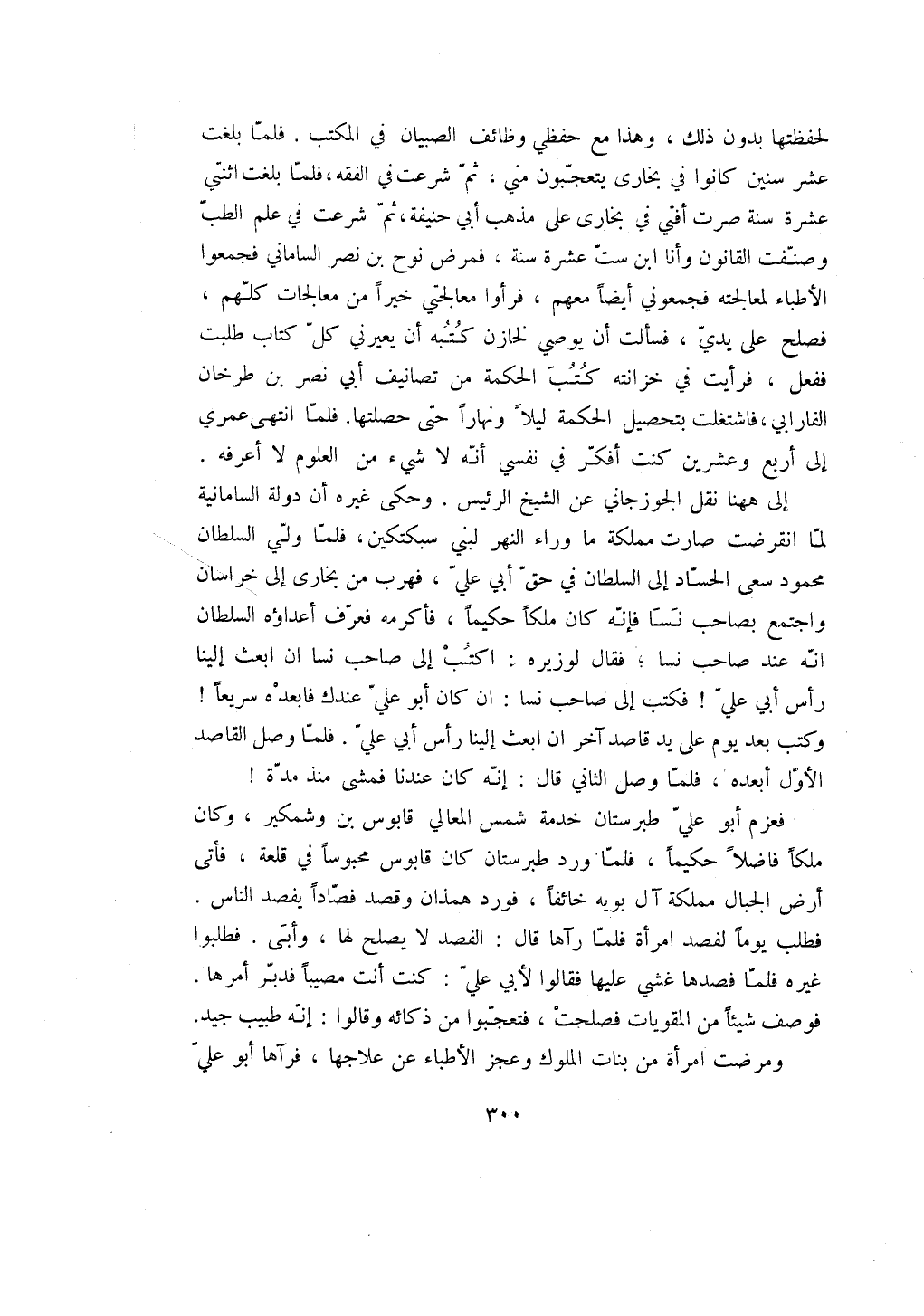 لحفظتها بدون ذلك، وهذا مع حفظي وظائف الصبيان في المكتب. فلما بلغت عشر سنين كانوا في بخارى يتعجبون مني، ثم شرعت في الفقه، فلما بلغت اثنتي عشرة سنة صرت أفتي في بخارى على مذهب أبي حنيفة، ثم شرعت في علم الطب وصنفت القانون وأنا ابن ست عشرة سنة، فمرض نوح بن نصر الساماني فجمعوا الأطباء لمعالجته فجمعوني أيضاً معهم، فرأوا معالجتي خيراً من معالجات كلهم، فصلح على يدي، فسألت أن يوصي لخازن كتبه أن يعيرني كل كتاب طلبت ففعل، فرأيت في خزانته كتب الحكمة من تصانيف أبي نصر بن طرخان الفارابي، فاشتغلت بتحصيل الحكمة ليلاً ونهاراً حتى حصلتها. فلما انتهى عمري إلى أربع وعشرين كنت أفكر في نفسي أنه لا شيء من العلوم لا أعرفه.