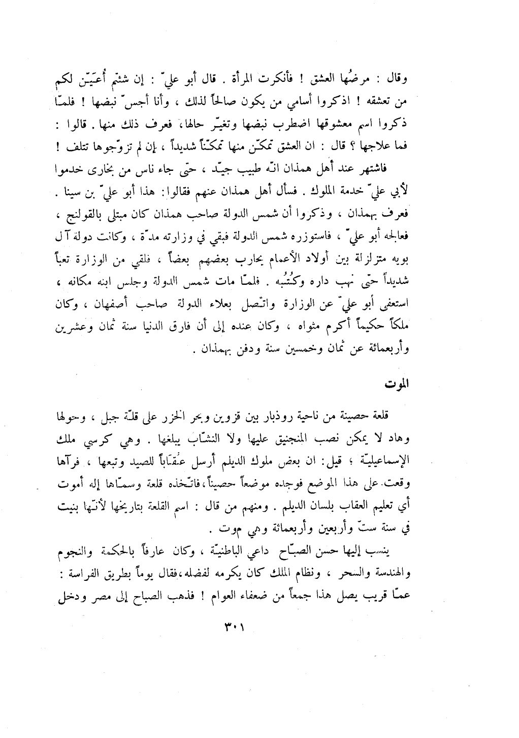 وقال: مرضها العشق! فأنكرت المرأة. قال أبو علي: إن شئتم أعين لكم من تعشقه! اذكروا أسامي من يكون صالحاً لذلك، وأنا أجس نبضها! فلما ذكروا اسم معشوقها اضطرب نبضها وتغير حالها، فعرف ذلك منها. قالوا: فما علاجها؟ قال: ان العشق تمكن منها تمكناً شديداً، إن لم تزوجوها تتلف! فاشتهر عند أهل همذان انه طبيب جيد، حتى جاء ناس من بخارى خدموا لأبي علي خدمة الملوك. فسأل أهل همذان عنهم فقالوا: هذا أبو علي بن سينا. فعرف بهمذان، وذكروا أن شمس الدولة صاحب همذان كان مبتلى بالقولنج، فعالجه أبو علي، فاستوزره شمس الدولة فبقي في وزارته مدة، وكانت دولة آل بويه متزلزلة بين أولاد الأعمام يحارب بعضهم بعضاً، فلقي من الوزارة تعباً شديداً حتى نهب داره وكتبه. فلما مات شمس الدولة وجلس ابنه مكانه، استعفى أبو علي عن الوزارة واتصل بعلاء الدولة صاحب أصفهان، وكان ملكاً حكيماً أكرم مثواه، وكان عنده إلى أن فارق الدنيا سنة ثمان وعشرين وأربعمائة عن ثمان وخمسين سنة ودفن بهمذان.