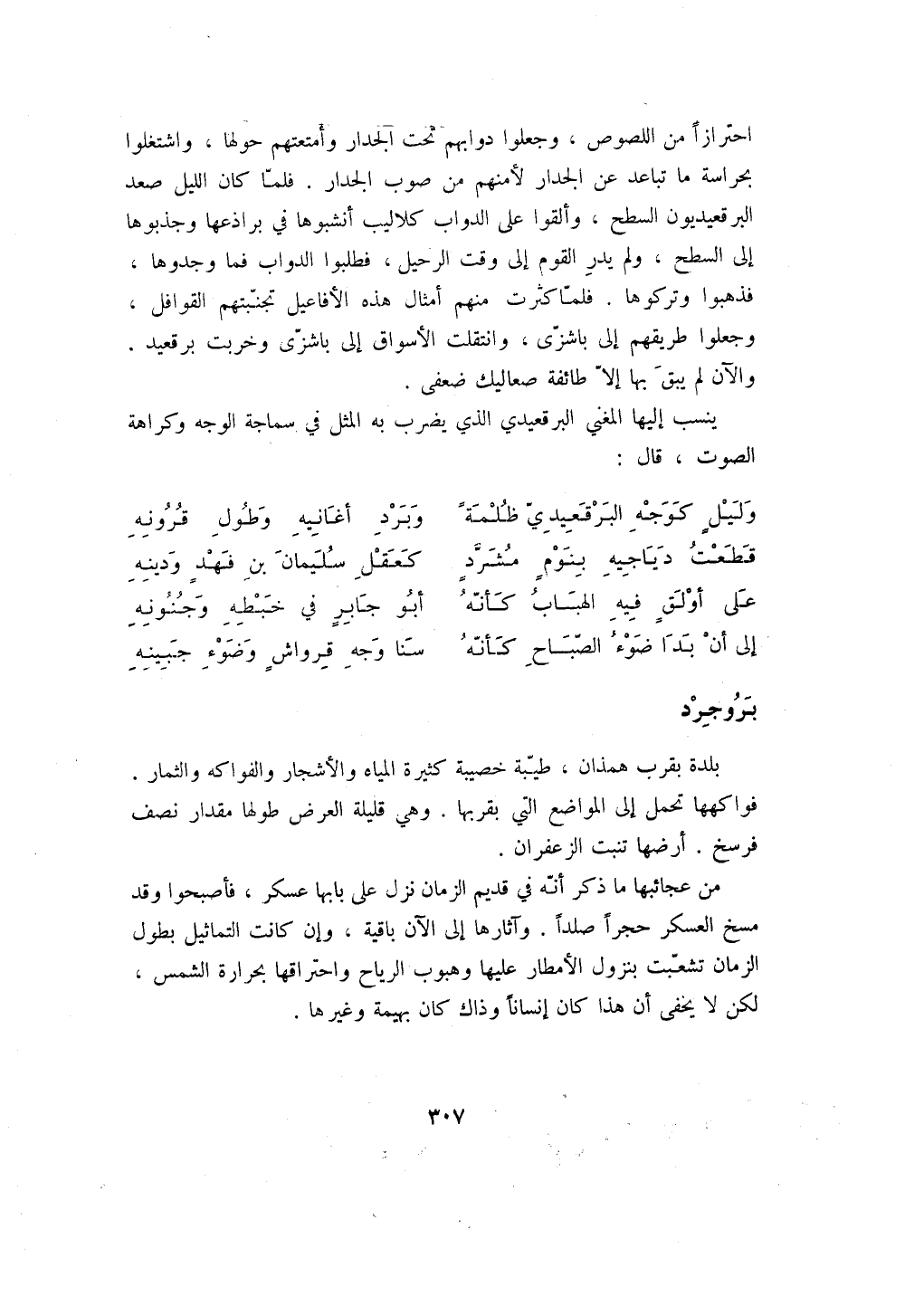 احترازاً من اللصوص، وجعلوا دوابهم تحت الجدار وأمتعتهم حولها، واشتغلوا بحراسة ما تباعد عن الجدار لأمنهم من صوب الجدار. فلما كان الليل صعد البرقعيديون السطح، وألقوا على الدواب كلاليب أنشبوها في براذعها وجذبوها إلى السطح، ولم يدر القوم إلى وقت الرحيل، فطلبوا الدواب فما وجدوها، فذهبوا وتركوها. فلما كثرت منهم أمثال هذه الأفاعيل تجنبتهم القوافل، وجعلوا طريقهم إلى باشزى، وانتقلت الأسواق إلى باشزى وخربت برقعيد. والآن لم يبق بها إلا طائفة صعاليك ضعفى.