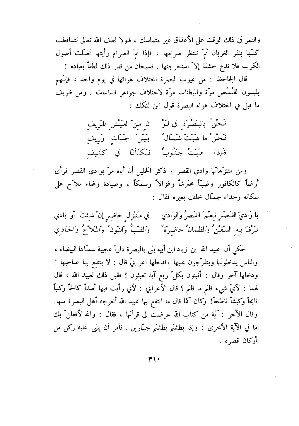 والتمر في ذلك الوقت على الأعذاق غير متماسك، فلولا لطف الله تعالى لتساقط، كلها بنقر الغربان ثم تنتظر صرامها، فإذا تم الصرام رأيتها تخللت أصول الكرب فلا تدع حشفة إلا استخرجتها. فسبحان من قدر ذلك لطفاً بعباده! قال الجاحظ: من عيوب البصرة اختلاف هوائها في يوم واحد، فإنهم يلبسون القمص مرة والمبطنات مرة لاختلاف جواهر الساعات. ومن ظريف ما قيل في اختلاف هواء البصرة قول ابن لنكك:
