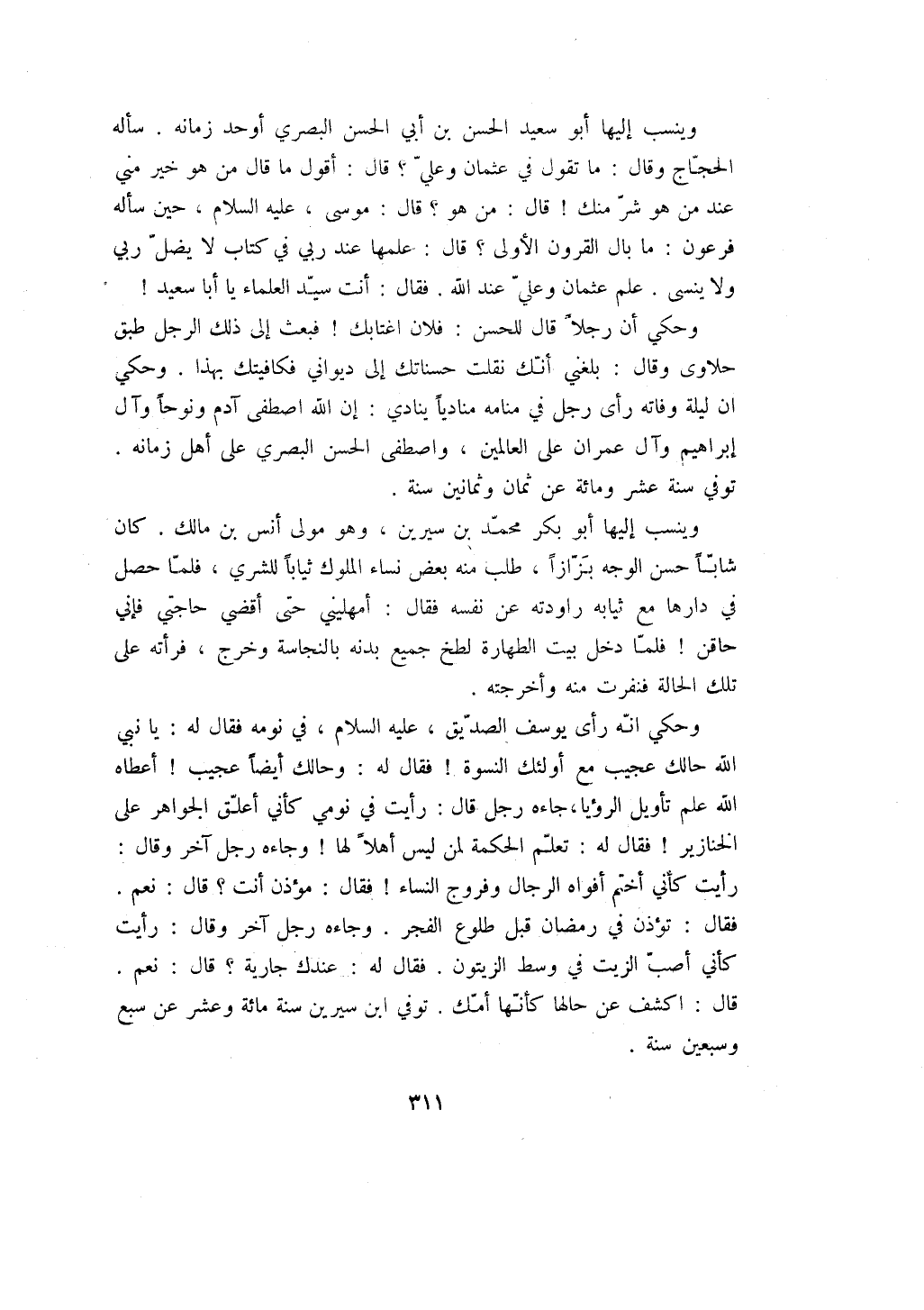 وينسب إليها أبو سعيد الحسن بن أبي الحسن البصري أوحد زمانه. سأله الحجاج وقال: ما تقول في عثمان وعلي؟ قال: أقول ما قال من هو خير مني عند من هو شر منك! قال: من هو؟ قال: موسى، عليه السلام، حين سأله فرعون: ما بال القرون الأولى؟ قال: علمها عند ربي في كتاب لا يضل ربي ولا ينسى. علم عثمان وعلي عند الله، فقال: أنت سيد العلماء يا أبا سعيد!