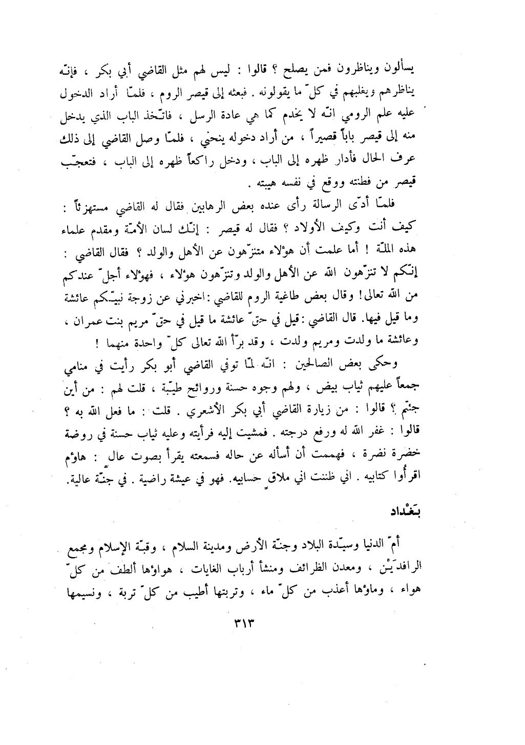 فلما أدى الرسالة رأى عنده بعض الرهابين فقال له القاضي مستهزئاً: كيف أنت وكيف الأولاد؟ فقال له قيصر: إنك لسان الأمة ومقدم علماء هذه الملة! أما علمت أن هؤلاء متنزهون عن الأهل والولد؟ فقال القاضي: إنكم لا تنزهون الله عن الأهل والولد وتنزهون هؤلاء، فهؤلاء أجل عندكم من الله تعالى! وقال بعض طاغية الروم للقاضي: اخبرني عن زوجة نبيكم عائشة وما قيل فيها. قال القاضي: قيل في حق عائشة ما قيل في حق مريم بنت عمران، وعائشة ما ولدت ومريم ولدت، وقد برأ الله تعالى كل واحدة منهما! وحكى بعض الصالحين: انه لما توفي القاضي أبو بكر رأيت في منامي جمعاً عليهم ثياب بيض، ولهم وجوه حسنة وروائح طيبة، قلت لهم: من أين جئتم؟ قالوا: من زيارة القاضي أبي بكر الأشعري. قلت: ما فعل الله به؟ قالوا: غفر الله له ورفع درجته. فمشيت إليه فرأيته وعليه ثياب حسنة في روضة خضرة نضرة، فهممت أن أسأله عن حاله فسمعته يقرأ بصوت عال: هاؤم اقرأوا كتابيه. اني ظننت اني ملاق حسابيه. فهو في عيشة راضية. في جنة عالية.
