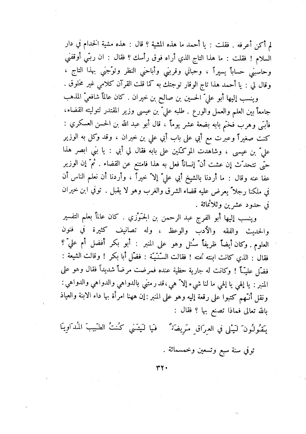 وينسب إليها أبو الفرج عبد الرحمن بن الجوزي. كان عالماً بعلم التفسير والحديث والفقه والأدب والوعظ، وله تصانيف كثيرة في فنون العلوم. وكان أيضاً ظريفاً سئل وهو على المنبر: أبو بكر أفضل أم علي؟ فقال: الذي كانت ابنته تحته! فقالت السنية: فضل أبا بكر! وقالت الشيعة: فضل علياً! وكانت له جارية حظية عنده فمرضت مرضاً شديداً فقال وهو على المنبر: يا إلهي يا إلهي ما لنا شيء إلا هي، قد رمتني بالدواهي والدواهي والدواهي: ونقل أنهم كتبوا على رقعة إليه وهو على المنبر: إن ههنا امرأة بها داء الابنة والعياذ بالله تعالى فماذا تصنع بها؟ فقال: