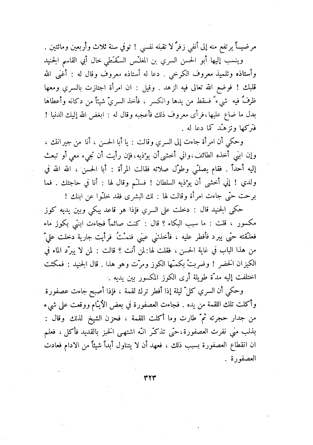 وحكي أن امرأة جاءت إلى السري وقالت: يا أبا الحسن، أنا من جيرانك، وإن ابني أخذه الطائف، واني أخشى أن يؤذيه، فإن رأيت أن تجيء معي أو تبعث إليه أحداً. فقام يصلي وطول صلاته فقالت المرأة: أبا الحسن، الله الله في ولدي! إني أخشى أن يؤذيه السلطان! فسلم وقال لها: أنا في حاجتك. فما برحت حتى جاءت امرأة وقالت لها: لك البشرى فقد خلوا عن ابنك! حكى الجنيد قال: دخلت على السري فإذا هو قاعد يبكي وبين يديه كوز مكسور، قلت: ما سبب البكاء؟ قال: كنت صائماً فجاءت ابنتي بكوز ماء فعلقته حتى يبرد فأفطر عليه، فأخذتني عيني فنمت فرأيت جارية دخلت علي من هذا الباب في غاية الحسن، فقلت لها: لمن أنت؟ قالت: لمن لا يبرد الماء في الكيزان الخضر! وضربت بكمتها الكوز ومرت وهو هذا. قال الجنيد: فمكثت اختلفت إليه مدة طويلة أرى الكوز المكسور بين يديه.