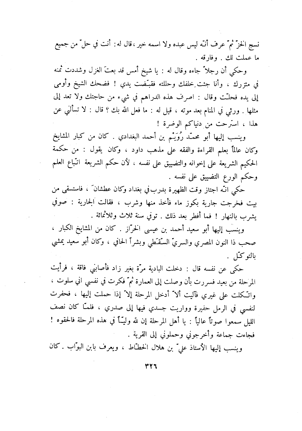 وحكي أن رجلاً جاءه وقال له: يا شيخ أمس قد بعت الغزل وشددت ثمنه في مئزرك، وأنا جئت خلفك وحللته فقبضت يدي! فضحك الشيخ وأومى إلى يده فحلت وقال: اصرف هذه الدراهم في شيء من حاجتك ولا تعد إلى مثلها. ورئي في المنام بعد موته، قيل له: ما فعل الله بك؟ قال: لا تسألني عن هذا، استرحت من دنياكم الوضرة! وينسب إليها أبو محمد رويم بن أحمد البغدادي. كان من كبار المشايخ وكان عالماً بعلم القراءة والفقه على مذهب داود، وكان يقول: من حكمة الحكيم الشريعة على إخوانه والتضييق على نفسه، لأن حكم الشريعة اتباع العلم وحكم الورع التضييق على نفسه.