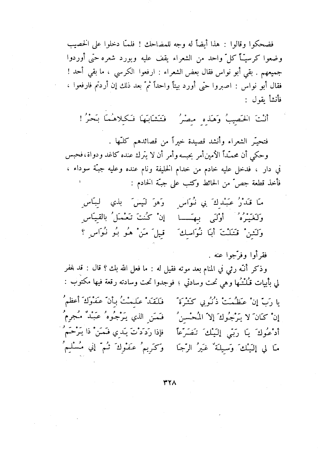 فضحكوا وقالوا: هذا أيضاً له وجه للمضاحك! فلما دخلوا على الخصيب وضعوا كرسياً كل واحد من الشعراء يقف عليه ويورد شعره حتى أوردوا جميعهم. بقي أبو نواس فقال بعض الشعراء: ارفعوا الكرسي، ما بقي أحد! فقال أبو نواس: اصبروا حتى أورد بيتاً واحداً ثم بعد ذلك إن أردتم فارفعوا، فأنشأ يقول:
