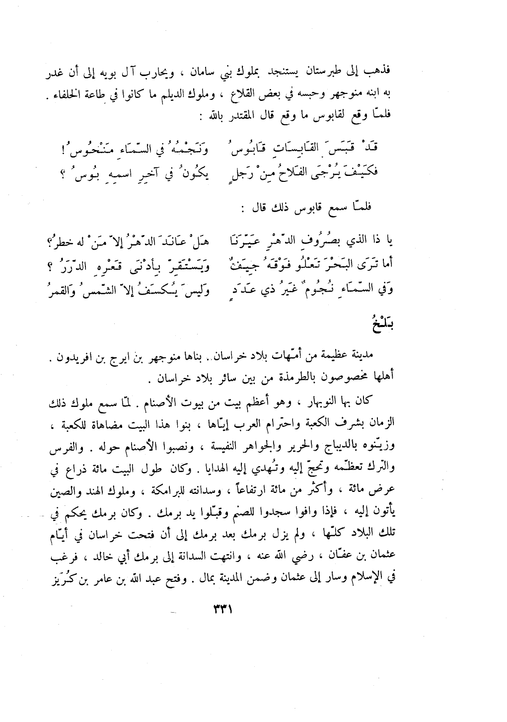 كان بها النوبهار، وهو أعظم بيت من بيوت الأصنام. لما سمع ملوك ذلك الزمان بشرف الكعبة واحترام العرب إياها، بنوا هذا البيت مضاهاة للكعبة، وزينوه بالديباج والحرير والجواهر النفية، ونصبوا الأصنام حوله. والفرس والترك تعظمه وتحج إليه وتهدي إليه الهدايا. وكان طول البيت مائة ذراع في عرض مائة، وأكثر من مائة ارتفاعاً، وسدانته للبرامكة، وملوك الهند والصين يأتون إليه، فإذا وافوا سجدوا للصنم وقبلوا يد برمك. وكان برمك يحكم في تلك البلاد كلها، ولم يزل برمك بعد برمك إلى أن فتحت خراسان في أيام عثمان بن عفان، رضي الله عنه، وانتهت السدانة إلى برمك أبي خالد، فرغب في الإسلام وسار إلى عثمان وضمن المدينة بمال، وفتح عبد الله بن عامر بن كريز