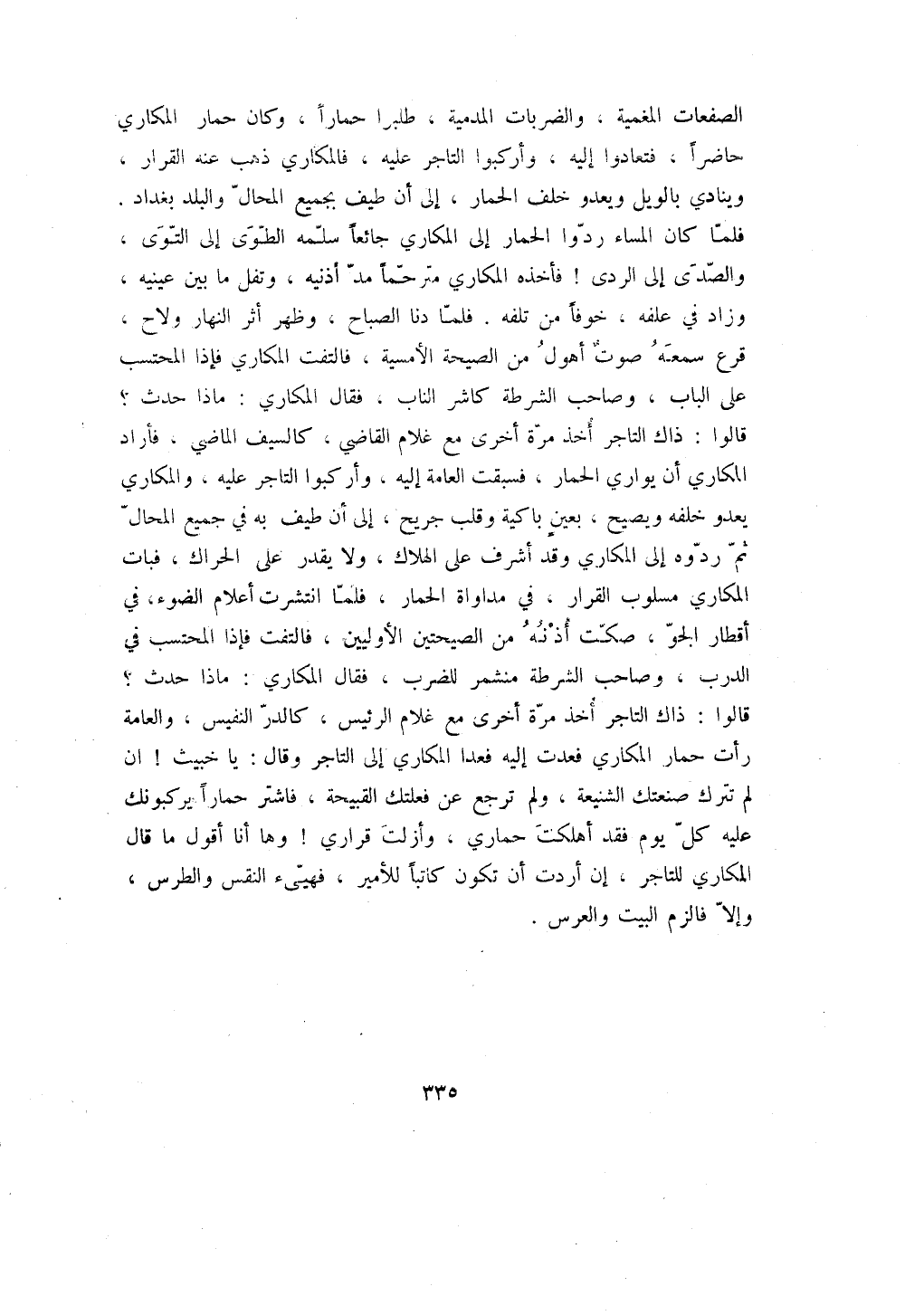الصفعات المغمية، والضربات المدمية، طلبوا حماراً، وكان حمار المكاري حاضراً، فتعادوا إليه، وأركبوا التاجر عليه، فالمكاري ذهب عنه القرار، وينادي بالويل ويعدو خلف الحمار، إلى أن طيف بجيمع المحال والبلد بغداد، فلما كان المساء ردوا الحمار إلى المكاري جائعاً سلم الطوى إلى التوى، والصدى إلى الردى! فأخذه المكاري مترحماً مد أذنيه، وتفل ما بين عينيه، وزاد في علفه، خوفاً من تلفه. فلما دنا الصباح، وظهر أثر النهار ولاح، قرع سمعه صوت أهول من الصيحة الأمسية، فالتفت المكاري فإذا المحتسب على الباب، وصاحب الشرطة كاشر الناب، فقال المكاري: ماذا حدث؟ قالوا: ذاك التاجر أخذ مرة أخرى مع غلام القاضي، كالسيف الماضي، فأراد المكاري أن يواري الحمار، فسبقت العامة إليه، وأركبوا التاجر عليه، والمكاري يعدو خلفه ويصيح، بعين باكية وقلب جريح، إلى أن طيف به في جميع المحال ثم ردوه إلى المكاري وقد أشرف على الهلاك، ولا يقدر على الحراك، فبات المكاري مسلوب القرار، في مداواة الحمار، فلما انتشرت أعلام الضوء، في أقطار الجو، صكت أذنه من الصيحتين الأوليين، فالتفت فإذا المحتسب في الدرب، وصاحب الشرطة منشمر للضرب، فقال المكاري: ماذا حدث؟ قالوا: ذاك التاجر أخذ مرة أخرى مع غلام الرئيس، كالدر النفيس، والعامة رأت حمار المكاري فعدت إليه فعدا المكاري إلى التاجر وقال: يا خبيث! ان لم تترك صنعتك الشنيعة، ولم ترجع عن فعلتك القبيحة، فاشتر حماراً يركبونك عليه كل يوم فقد أهلكت حماري، وأزلت قراري! وها أنا أقول ما قال المكاري للتاجر، إن أردت أن تكون كاتباً للأمير، فهييء النقس والطرس، وإلا فالزم البيت والعرس.