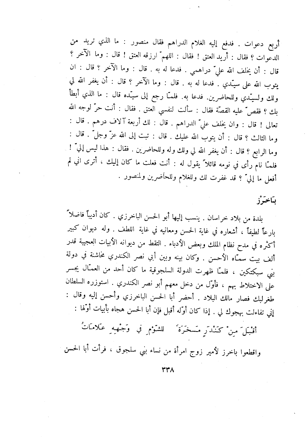 واقطعوا باخرز لأمير زوج امرأة من نساء بني سلجوق، فرأت أبا الحسن
