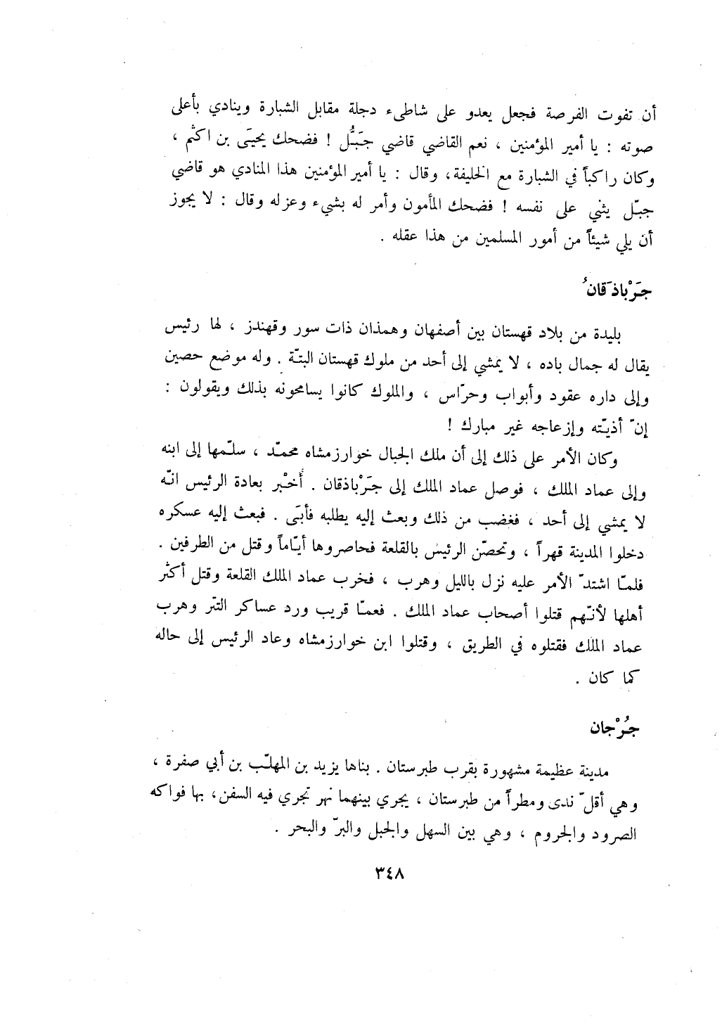 أن تفوت الفرصة فجعل يعدو على شاطيء دجلة مقابل الشبارة وينادي بأعلى صوته: يا أمير المؤمنين، نعم القاضي قاضي جبل! فضحك يحيى بن اكثم، وكان راكباً في الشبارة مع الخليفة، وقال: يا أمير المؤمنين هذا المنادي هو قاضي جبل يثني على نفسه! فضحك المأمون وأمر له بشيء وعزله وقال: لا يجوز أن يلي شيئاً من أمور المسلمين من هذا عقله.