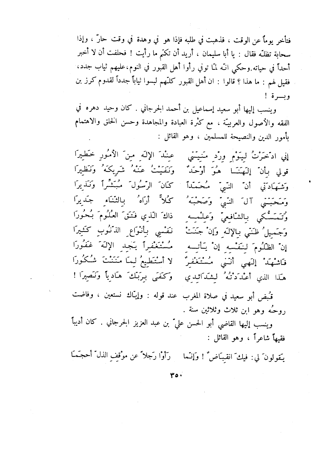 فتأخر يوماً عن الوقت، فذهبت في طلبه فإذا هو في وهدة في وقت حار، وإذا سحابة تظله فقال: يا أبا سليمان، أريد أن تكتم ما رأيت! فحلفت أن لا أخبر أحداً في حياته. وحكي انه لما توفي رأوا أهل القبور في النوم، عليهم ثياب جدد، فقيل لهم: ما هذا؟ قالوا: ان أهل القبور كلهم لبسوا ثياباً جدداً لقدوم كرز بن وبرة! وينس إليها أبو سعيد إسماعيل بن أحمد الجرجاني. كان وحيد دهره في الفقه والأصول والعربية، مع كثرة العبادة والمجاهدة وحسن الخلق والاهتمام بأمور الدين والنصيحة للمسلمين، وهو القائل: