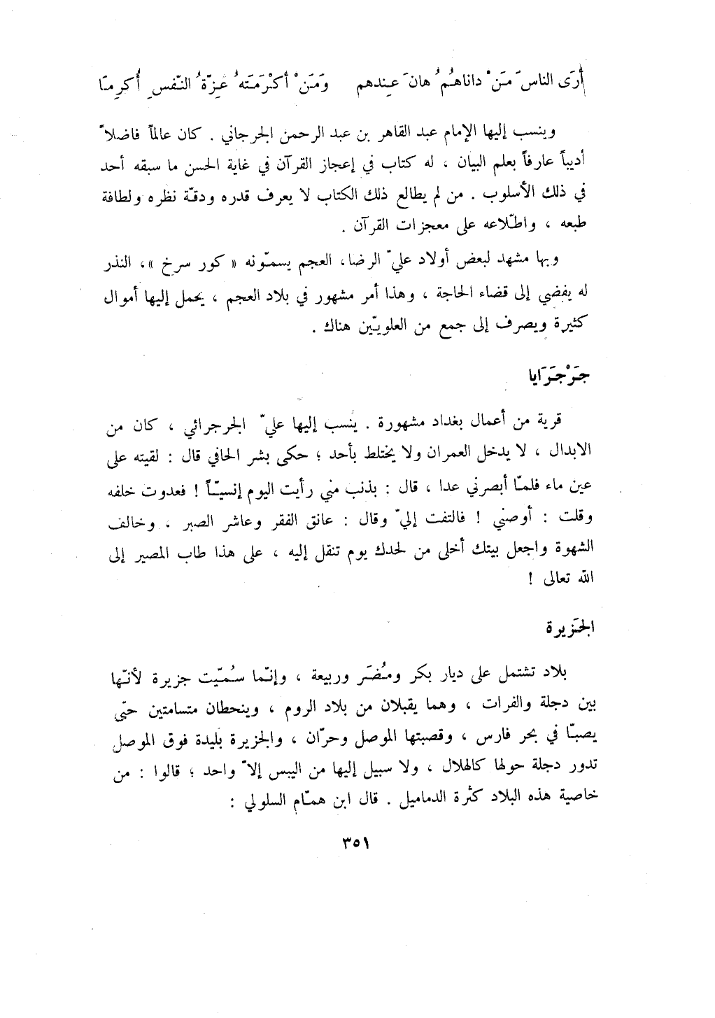 وينسب إليها الإمام عبد القاهر بن عبد الرحمن الجرجاني. كان عالماً فاضلاً أديباً عارفاً بعلم البيان، له كتاب في إعجاز القرآن في غاية الحسن ما سبقه أحد في ذلك الأسلوب. من لم يطالع ذلك الكتاب لا يعرف قدره ودقة نظره ولطافة طبعه، واطلاعه على معجزات القرآن.