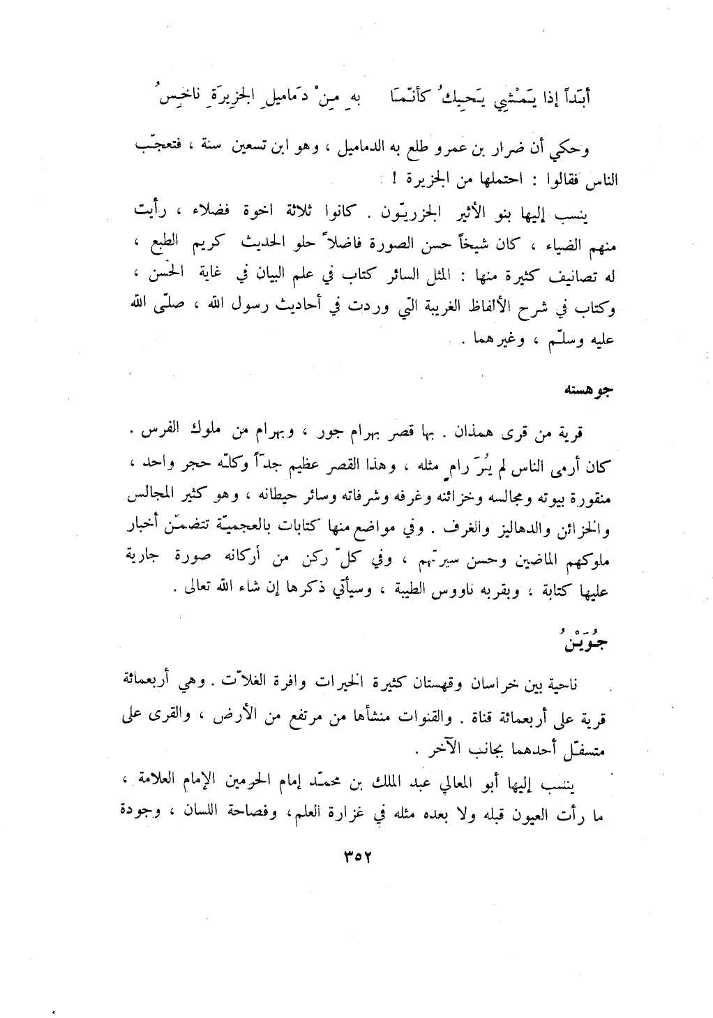 وحكي أن ضرار بن عمرو طلع به الدماميل، وهو ابن تسعين سنة، فتعجب الناس فقالوا: احتملها من الجزيرة! ينسب إليها بنو الأثير الجزريون. كانوا ثلاثة اخوة فضلاء، رأيت منهم الضياء، كان شيخاً حسن الصورة فاضلاً حلو الحديث كريم الطبع، له تصانيف كثيرة منها: المثل السائر كتاب في علم البيان في غاية الحسن، وكتاب في شرح الألفاظ الغريبة التي وردت في أحاديث رسول الله، صلى الله عليه وسلم، وغيرهما.