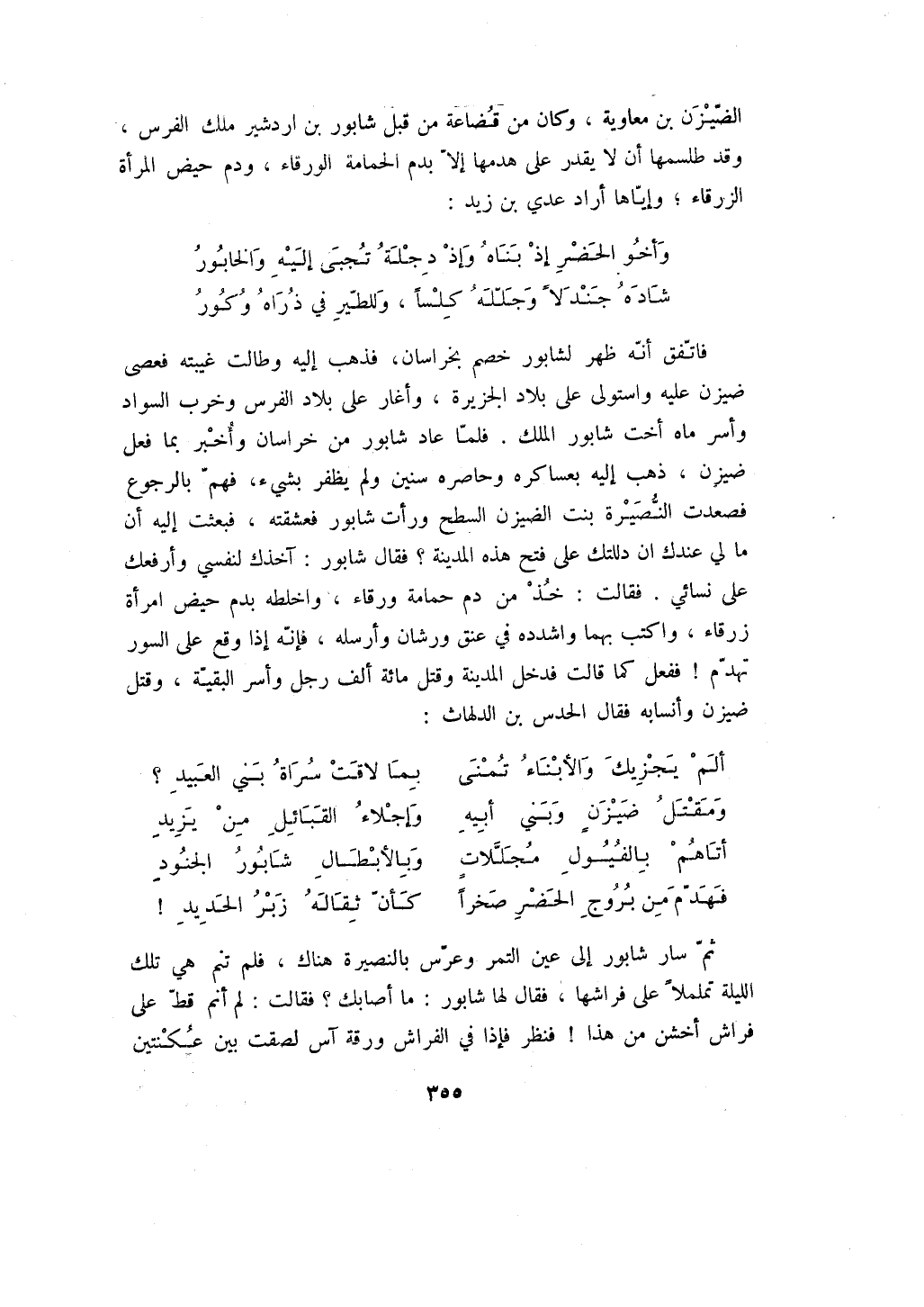 فاتفق أنه ظهر لشابور خصم بخراسان، فذهب إليه وطالت غيبته فعصى ضيزن عليه واستوى على بلاد الجزيرة، وأغار على بلاد الفرس وخرب السواد وأسر ماه أخت شابور الملك. فلما عاد شابور من خراسان وأخبر بما فعل ضيزن، ذهب إليه بعساكره وحاصره سنين ولم يظفر بشيء، فهم بالرجوع فصعدت النصيرة بنت الضيزن السطح ورأت شابور فعشقته، فبعثت إليه أن ما لي عندك ان دللتك على فتح هذه المدينة؟ فقال شابور: آخذك لنفسي وأرفعك على نسائي. فقالت: خذ من دم حمامة ورقاء، واخلطه بدم حيض امرأة زرقاء، واكتب بهما واشدده في عنق ورشان وأرسله، فإنه إذا وقع على السور تهدم! ففعل كما قالت فدخل المدينة وقتل مائة ألف رجل وأسر البقية، وقتل ضيزن وأنسابه فقال الحدس بن الدلهاث: