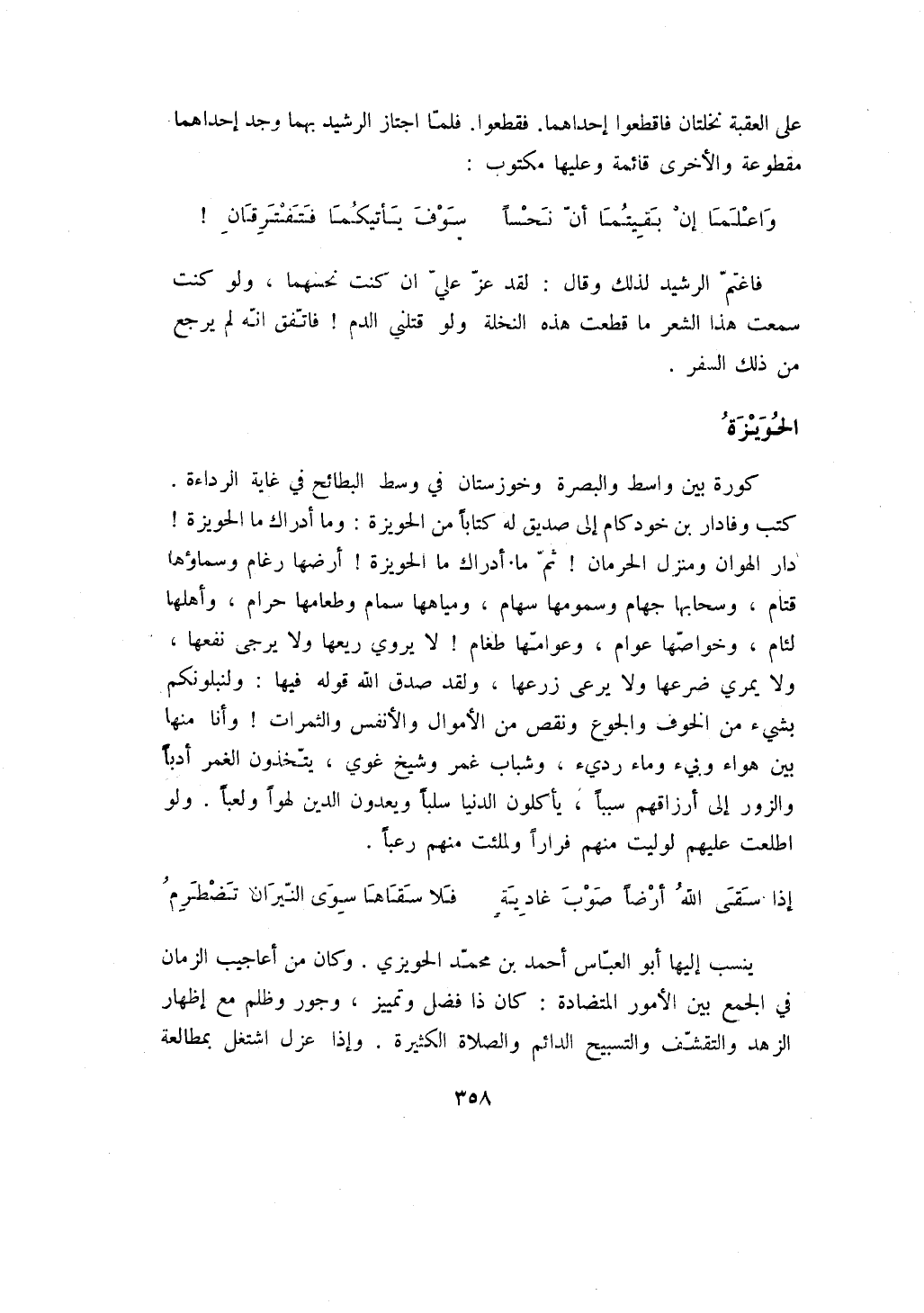 كورة بين واسط والبصرة وخوزستان في وسط البطائح في غاية الرداءة. كتب وفادار بن خودكام إلى صديق له كتاباً من الحويزة: وما أدراك ما الحويزة! دار الهوان ومنزل الحرمان! ثم ما أدراك ما الحويزة! أرضها رغام وسماؤها قتام، وسحابها جهام وسمومها سهام، ومياهها سمام وطعامها حرام، وأهلها لئام، وخواصها عوام، وعوامها طغام! لا يروي ريعها ولا يرجى نفعها، ولا يمري ضرعها ولا يرعى زرعها، ولقد صدق الله قوله فيها: ولنبلونكم بشيء من الخوف والجوع ونقص من الأموال والأنفس والثمرات! وأنا منها بين هواء وبيء وماء رديء، وشباب غمر وشيخ غوي، يتخذون الغمر أدباً والزور إلى أرزاقهم سبباً، يأكلون الدنيا سلباً ويعدون الدين لهواً ولعباً. ولو اطلعت عليهم لوليت منهم فراراً ولملئت منهم رعباً.