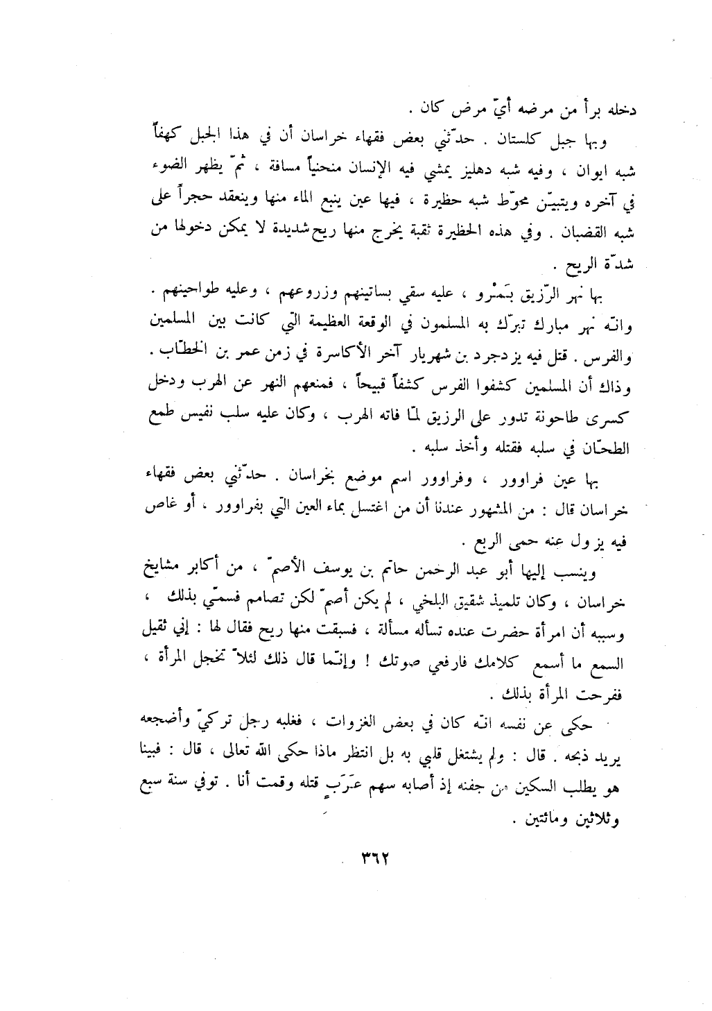 حكى عن نفسه انه كان في بعض الغزوات، فغلبه رجل تركي وأضجعه يريد ذبحه. قال: ولم يشتغل قلبي به بل انتظر ماذا حكى الله تعالى، قال: فبينا هو يطلب السكين من جفنه إذ أصابه سهم عرب قتله وقمت أنا. توفي سنة سبع وثلاثين ومائتين.