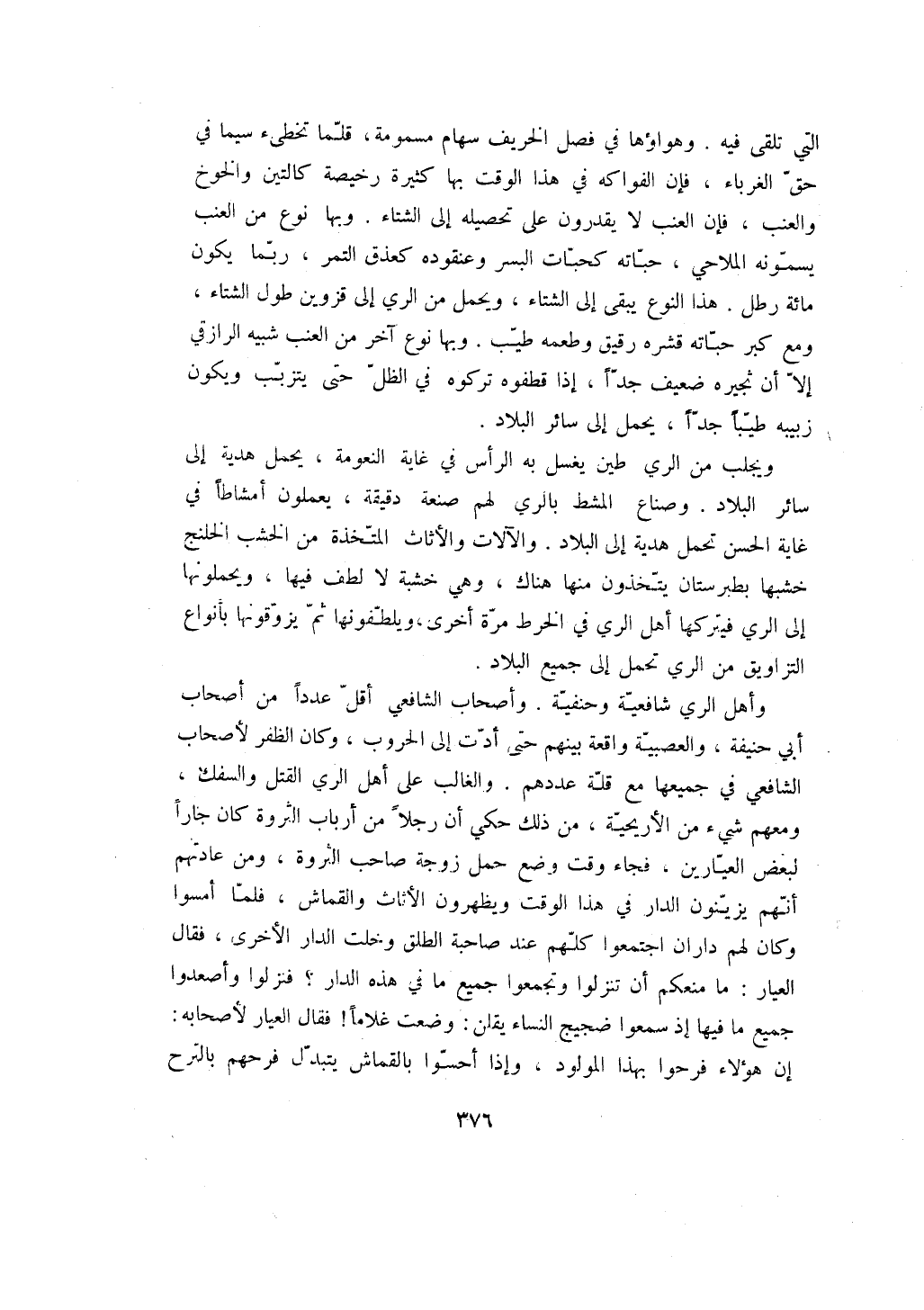وأهل الري شافعية وحنفية. وأصحاب الشافعي أقل عدداً من أصحاب أبي حنيفة، والعصبية واقعة بينهم حتى أدت إلى الحروب، وكان الظفر لأصحاب الشافعي في جميعها مع قلة عددهم. والغالب على أهل الري القتل والسفك، ومعهم شيء من الأريحية، من ذلك حكي أن رجلاً من أرباب الثروة كان جاراً لبعض العيارين، فجاء وقت وضع حمل زوجة صاحب الثروة، ومن عادتهم أنهم يزينون الدار في هذا الوقت ويظهرون الأثاث والقماش، فلما أمسوا وكان لهم داران اجتمعوا كلهم عند صاحبة الطلق وخلت الدار الأخرى، فقال العيار: ما منعكم أن تنزلوا وتجمعوا جميع ما في هذه الدار؟ فنزلوا وأصعدوا جميع ما فيها إذ سمعوا ضجيج النساء يقلن: وضعت غلاماً! فقال العيار لأصحابه: إن هؤلاء فرحوا بهذا المولود، وإذا أحسوا بالقماش يتبدل فرحهم بالترح