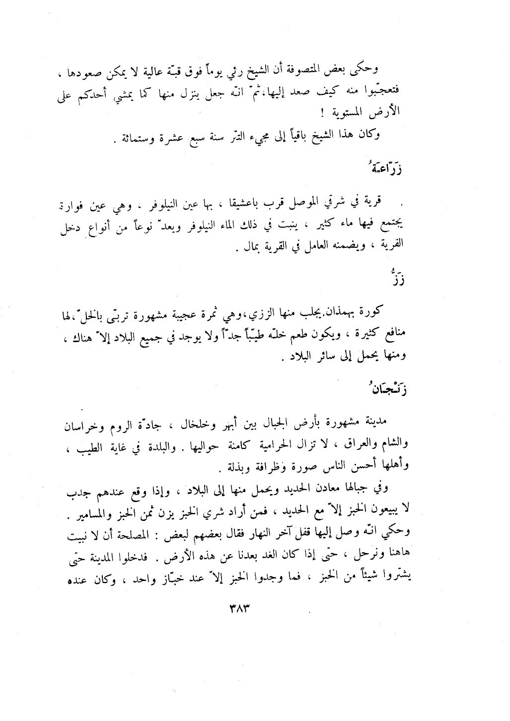 وفي جبالها معادن الحديد ويحمل منها إلى البلاد، وإذا وقع عندهم جدب لا يبيعون الخبز إلا مع الحديد، فمن أراد شري الخبز يزن ثمن الخبز والمسامير. وحكي انه وصل إليها قفل آخر النهار فقال بعضهم لبعض: المصلحة أن لا نبيت ها هنا ونرحل، حتى إذا كان الغد بعدنا عن هذه الأرض. فدخلوا المدينة حتى يشتروا شيئاً من الخبز، فما وجدوا الخبز إلا عند خباز واحد، وكان عنده