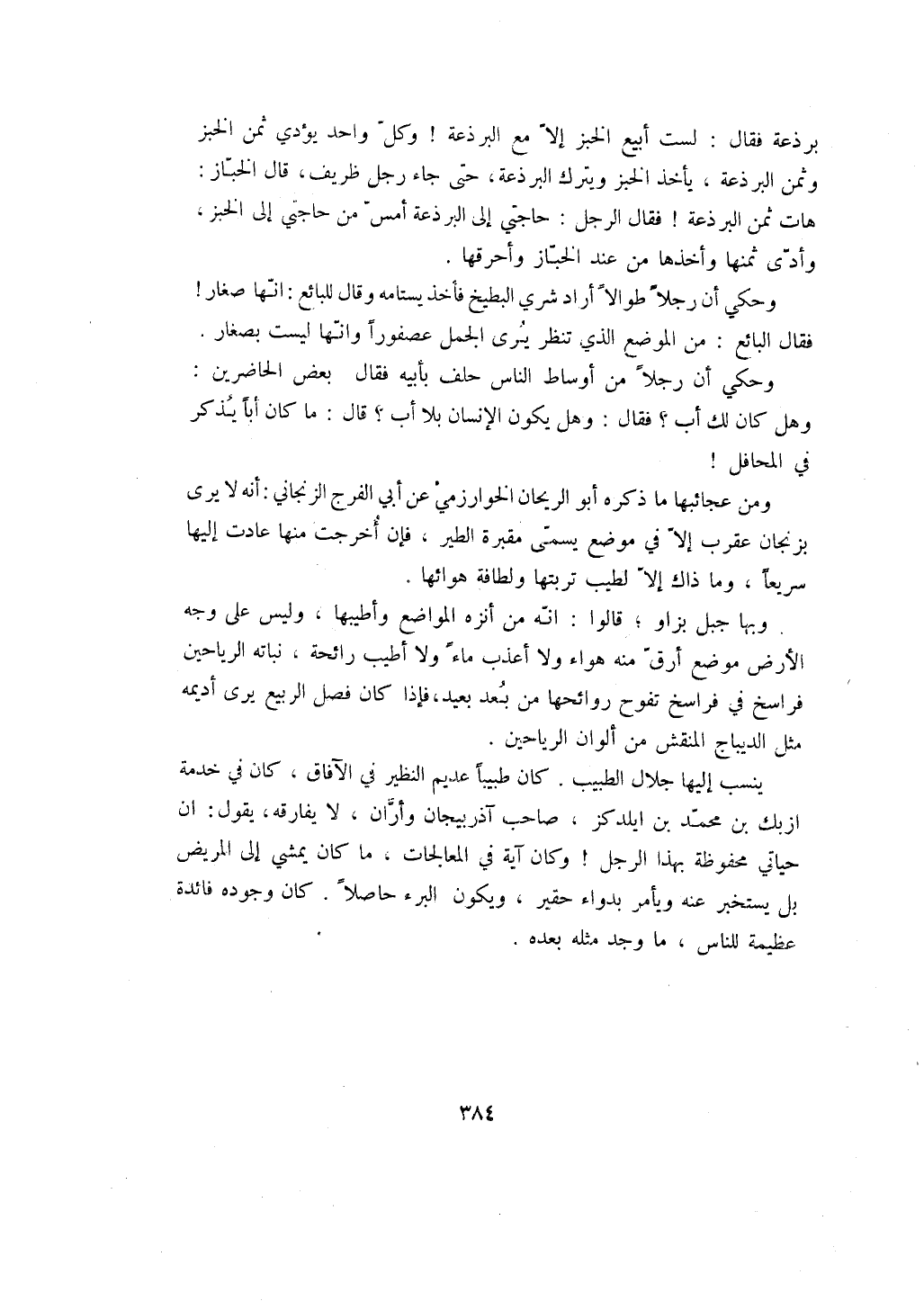 برذعة فقال: لست أبيع الخبز إلا مع البرذعة! وكل واحد يؤدي ثمن الخبز وثمن البرذعة، يأخذ الخبز ويترك البرذعة، حتى جاء رجل ظريف، قال الخباز: هات ثمن البرذعة! فقال الرجل: حاجتي إلى البرذعة أمس من حاجتي إلى الخبز، وأدى ثمنها وأخذها من عند الخباز وأحرقها.