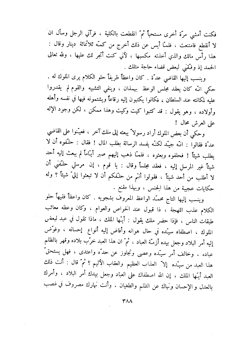 فكنت أمشي مرة أخرى مستحياً ثم انقطعت بالكلية، فرآني الرجل وسأل ان لا أنقطع فامتنعت، فلما ايس عن ذلك أخرج من كمه ثلاثمائة دينار وقال: هذا رأس مالك والذي أخذته مكسبها، لأني كنت أتجر لك عليها، ولله تعالى الحمد إذ وفقني لبعض قضاء حاجة مثلك.