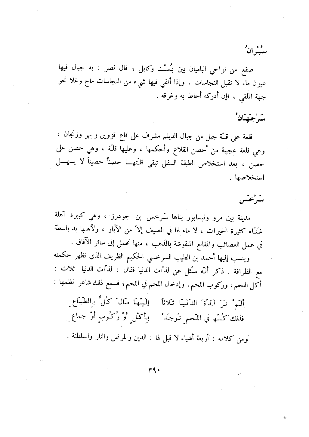 وينسب إليها أحمد بن الطيب السرخسي الحكيم الظريف الذي تظهر حكمته مع الظرافة. ذكر أنه سئل عن لذات الدنيا فقال: لذات الدنيا ثلاث: أكل اللحم، وركوب اللحم، وإدخال اللحم في اللحم؛ فسمع ذلك شاعر نظمها: