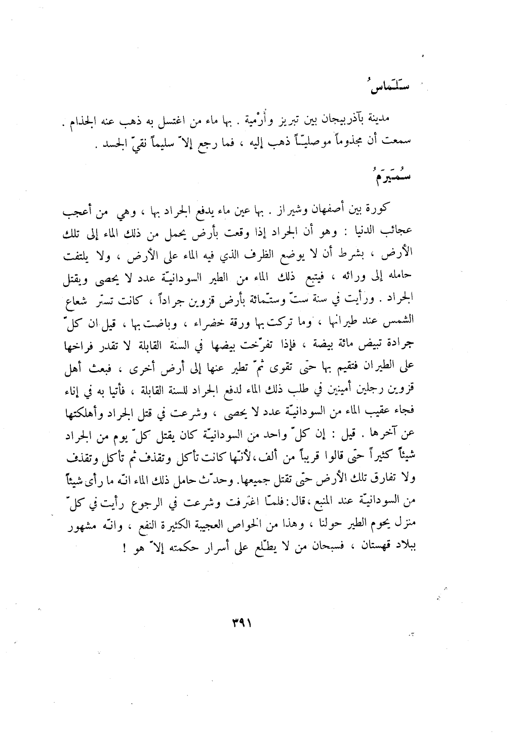 كورة بين أصفهان وشيراز. بها عين ماء يدفع الجراد بها، وهي من أعجب عجائب الدنيا: وهو أن الجراد إذا وقعت بأرض يحمل من ذلك الماء إلى تلك الأرض، بشرط أن لا يوضع الظرف الذي فيه الماء على الأرض، ولا يلتفت حامله إلى ورائه، فيتبع ذلك الماء من الطير السودانية عدد لا يحصى ويقتل الجراد. ورأيت في سنة ست وستمائة بأرض قزوين جراداً، كانت تستر شعاع الشمس عند طيرانها، وما تركت بها ورقة خضراء، وباضت بها، قيل ان كل جرادة تبيض مائة بيضة، فإذا تفرخت بيضها في السنة القابلة لا تقدر فراخها على الطيران فتقيم بها حتى تقوى ثم تطير عنها إلى أرض أخرى، فبعث أهل قزوين رجلين أمينين في طلب ذلك الماء لدفع الجراد للسنة القابلة، فأتيا به في إناء فجاء عقيب الماء من السودانية عدد لا يحصى، وشرعت في قتل الجراد وأهلكتها عن آخرها. قيل: إن كل واحد من السودانية كان يقتل كل يوم من الجراد شيئاً كثيراً حتى قالوا قريباً من ألف، لأنها كانت تأكل وتقذف ثم تأكل وتقذف ولا تفارق تلك الأرض حتى تقتل جميعها. وحدث حامل ذلك الماء انه ما رأى شيئاً من السودانية عند المنبع، قال: فلما اغترفت وشرعت في الرجوع رأيت في كل منزل يحوم الطير حولنا، وهذا من الخواص العجيبة الكثيرة النفع، وانه مشهور ببلاد قهستان، فسبحان من لا يطلع على أسرار حكمته إلا هو!