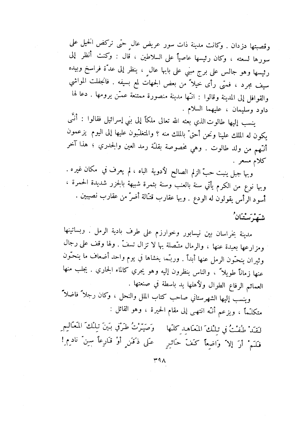 وقصبتها دزدان. وكانت مدينة ذات سور عريض عال حتى تركض الخيل على سورها لسعته، وكان رئيسها عاصياً على السلاطين، قال: وكنت أنظر إلى رئيسها وهو جالس على برج مبني على بابها عال، ينظر إلى عدة فراسخ وبيده سيف مجرد، فمتى رأى خيلاً من بعض الجهات لمع بسيفه. فانجفلت المواشي والقوافل إلى المدينة وقالوا: انها مدينة منصورة ممتنعة عمن يرومها. دعا لها داود وسليمان، عليهما السلام.